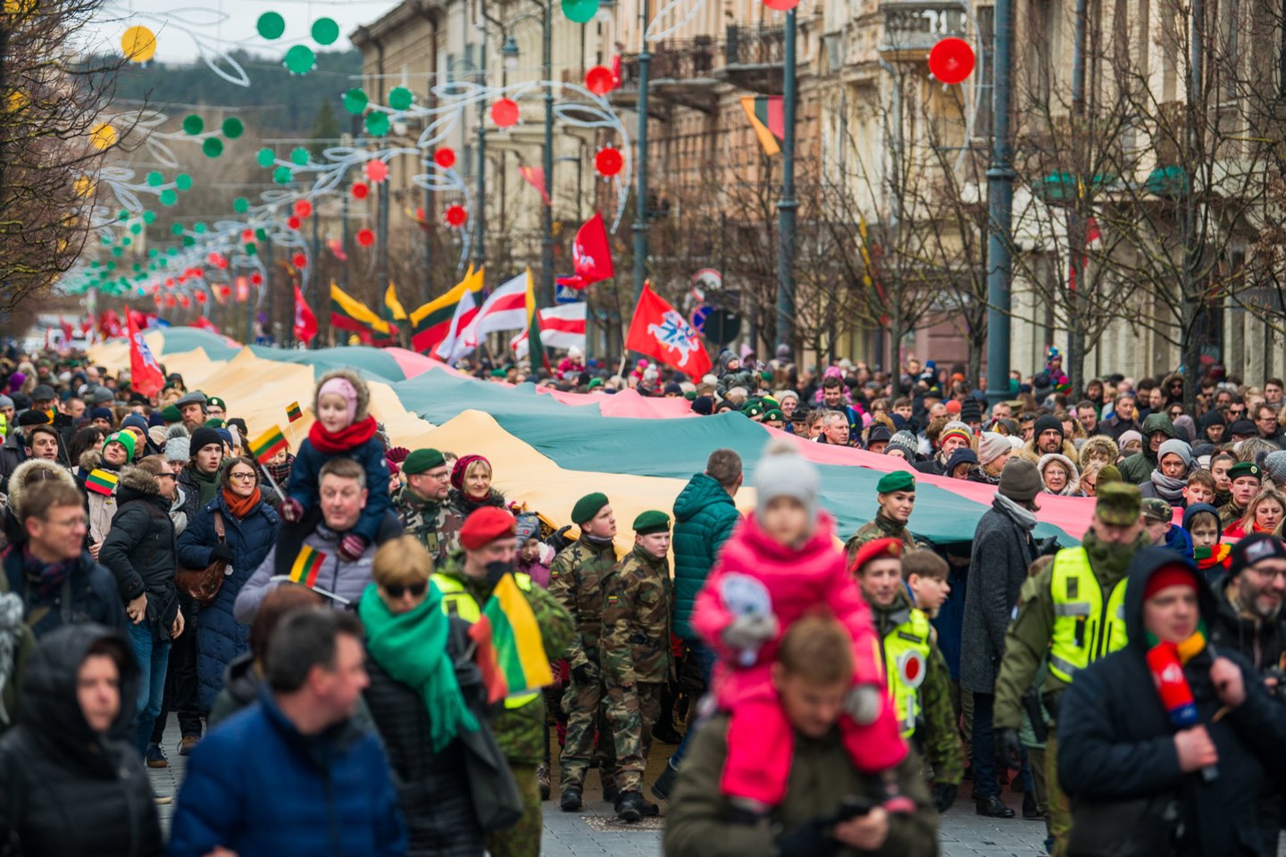 Tuo metu Gedimino prospektu šauliai, skautai ir į šventę susirinkę šalies gyventojai nešė 400 metrų ilgio trispalvę.