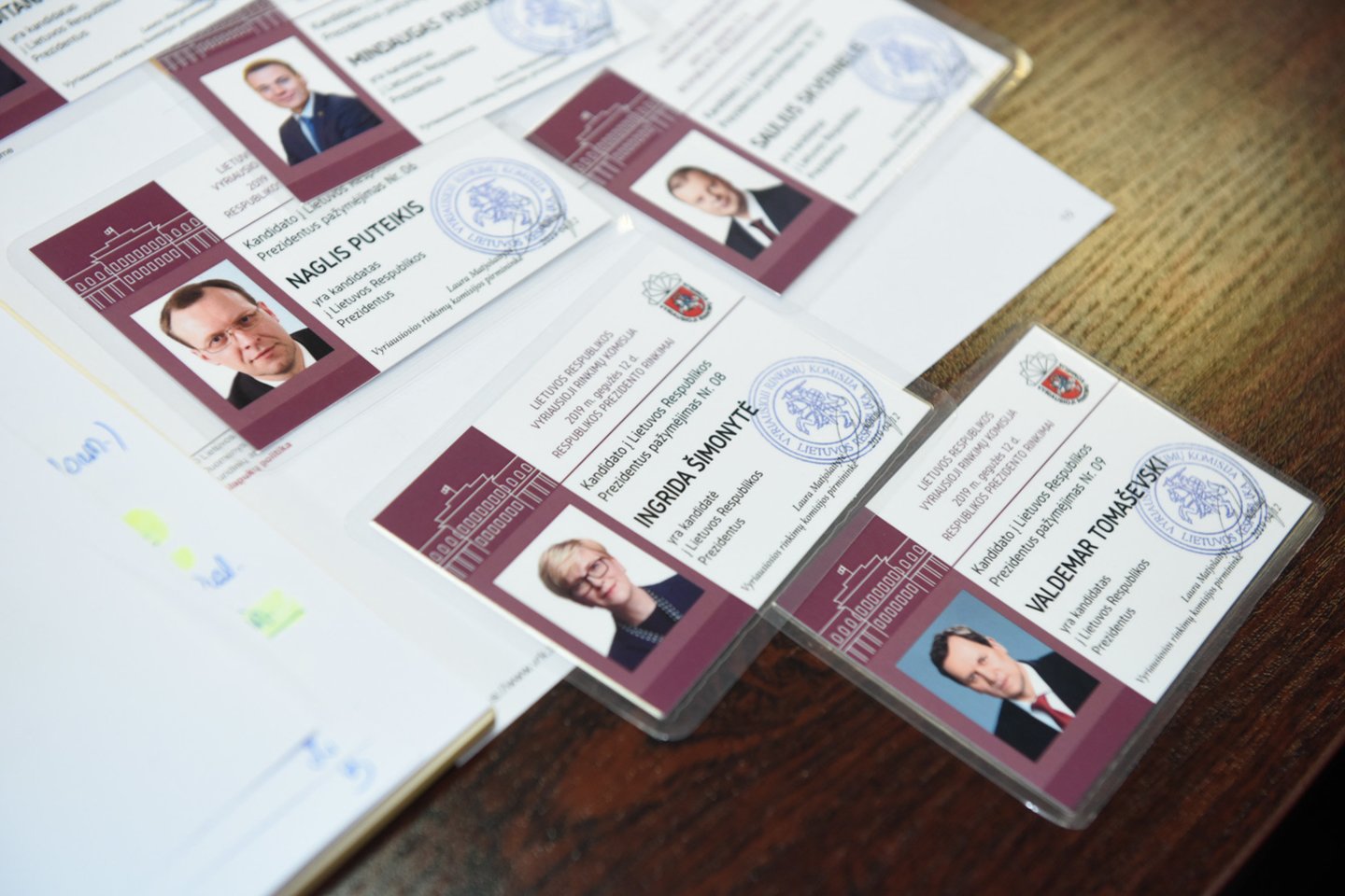 Atsiimti pažymėjimų atvyko prezidento posto siekiantys Naglis Puteikis, Gitanas Nausėda ir Arvydas Juozaitis. Už kitus kandidato prezidento rinkimuose pažymėjimus atsiėmė jų štabų atstovai.