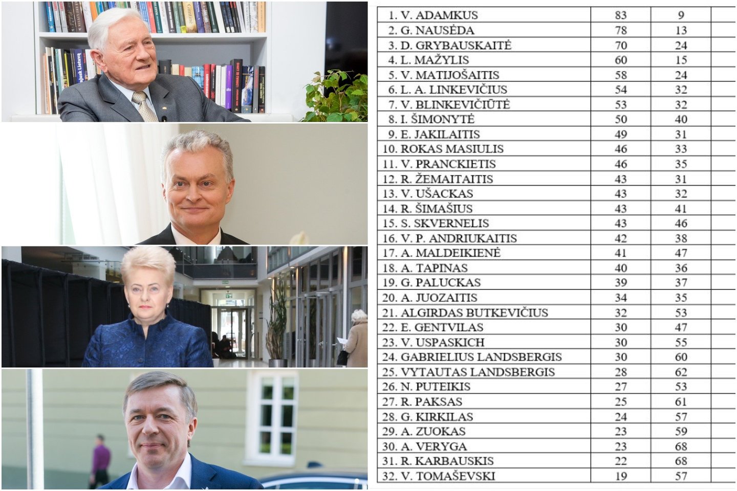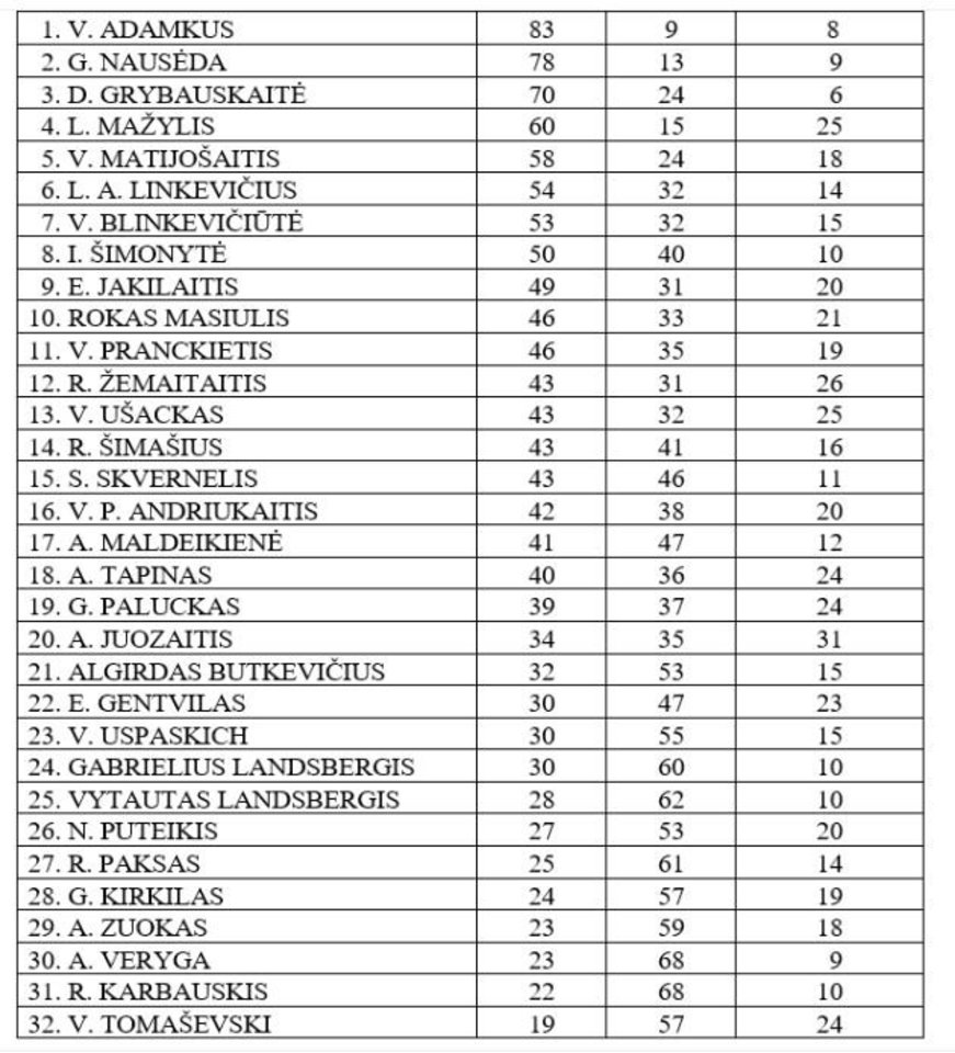 Nepalankiausiai vertinamų asmenybių sąraše taip pat yra R.Paksas (61 proc. nepalankiai ir 25 proc. palankiai), dabartinis konservatorių vadovas Gabrielius Landsbergis (atitinkamai 60 proc. ir 30 proc.), buvęs sostinės meras Artūras Zuokas (59 proc. ir 32 proc.), į valdančiąją daugumą įsiliejusios Lietuvos lenkų rinkimų akcijos-Krikščioniškų šeimų sąjungos lyderis Valdemaras Tomaševskis (57 proc. ir 19 proc.), diskusijų dėl rotacijos Seimo pirmininko poste epicentre atsidūręs „socialdarbiečių“ pirmininkas Gediminas Kirkilas (57 proc. ir 24 proc.), Darbo partijos lyderis Viktoras Uspaskichas (55 proc. ir 30 proc.), iš valstiečių frakcijos Seime tai pasitraukiantis, tai vėl sugrįžtantis Lietuvos centro partijos lyderis Naglis Puteikis (53 proc. 27 proc.) ir ekspremjeras Algirdas Butkevičius (53 proc. ir 32 proc.).