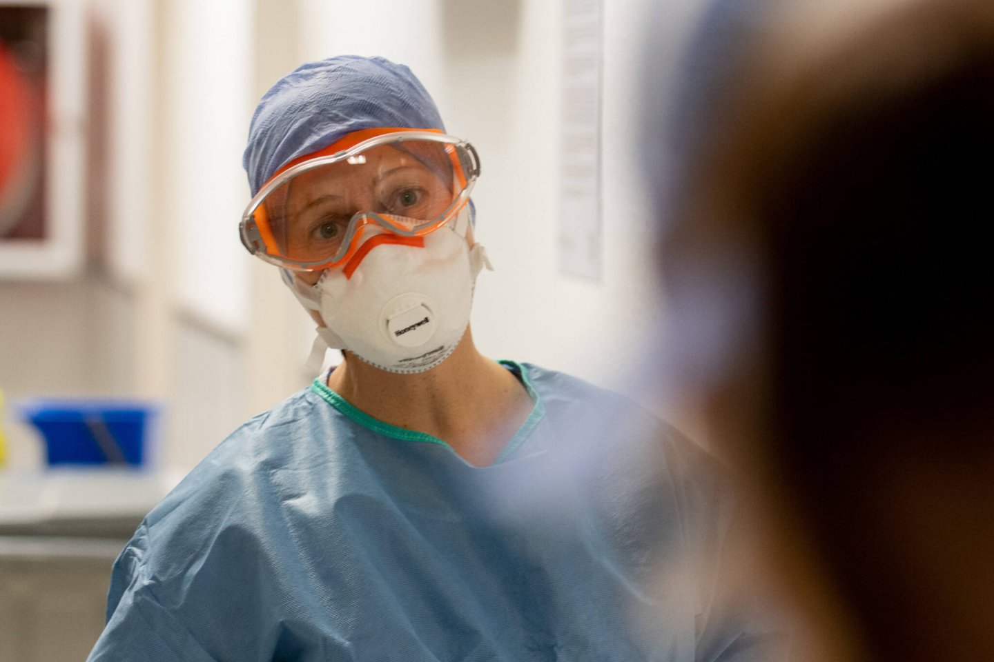 Reikia kombinezonų su gobtuvais, apsauginių akinių ar skydų, antbačių, vienkartinių kepuraičių, apsauginių prijuosčių, guminių pirštinių.