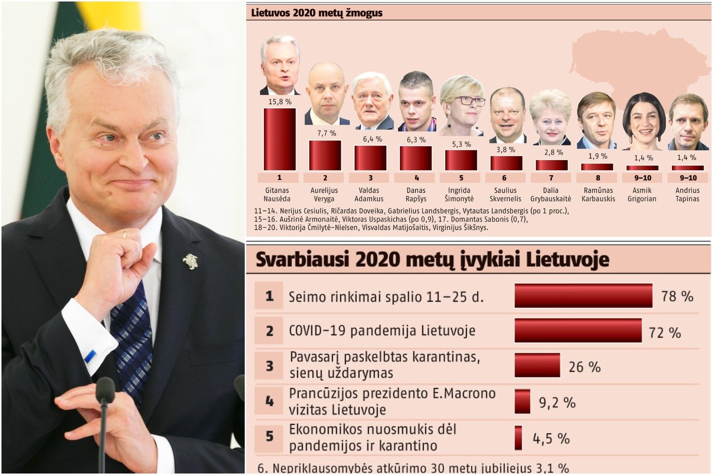 Lietuvos metų žmogaus rinkimus prezidentas G.Nausėda laimėjo antrus metus paeiliui (prieš 2 metus tokioje apklausoje jis buvo šeštas, o prieš 3 metus – dešimtas).