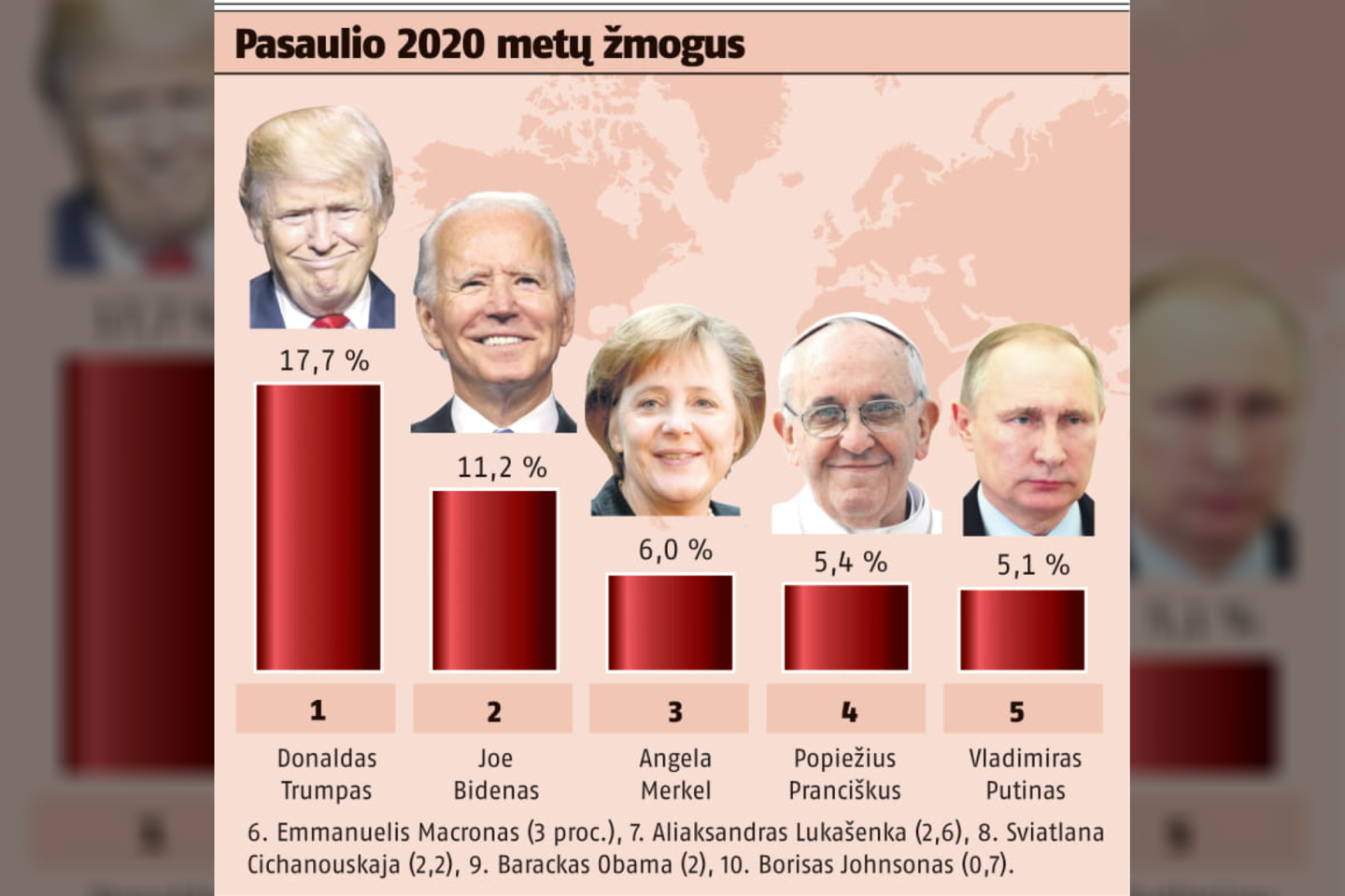 Pasaulio 2020 metų žmogumi apklausos dalyviai ketvirtą kartą išrinko rinkimus pralaimėjusį JAV prezidentą D.Trumpą (iki šiol per pastaruosius 21 metus lietuviai beveik visada šį titulą skyrė JAV prezidentams ir tiktai du kartus pirmas buvo Rusijos vadovas Vladimiras Putinas).
