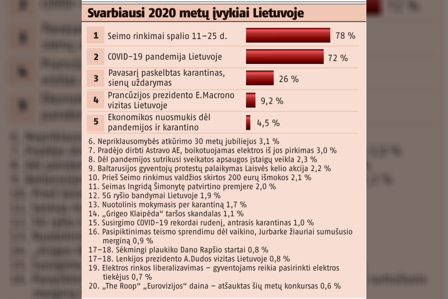Verta atkreipti dėmesį, kad apklausa buvo surengta lapkričio 6–30 dienomis, kai dar nebuvo tokie grėsmingi užsikrėtimų ir mirčių skaičiai, taip pat nebuvo paskelbtas sugriežtintas karantinas. Taigi galima spėti, kad dabar gyventojai svarbiausiu 2020 metų įvykiu laikytų COVID-19 pandemiją.