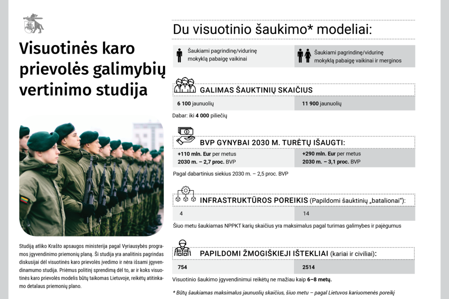 Kaip nurodoma studijoje, priklausomai nuo priimtų sprendimų, galimai būtų pasirinktas vienas iš dviejų modelių: 1) nuolatinę privalomąją pradinę karo tarnybą būtų šaukiami atlikti 18-19 m. vaikinai (tai sudarytų apie 6,1 tūkst.) arba 2) 18-19 m. vaikinai ir merginos (apie 11,9 tūkst.).