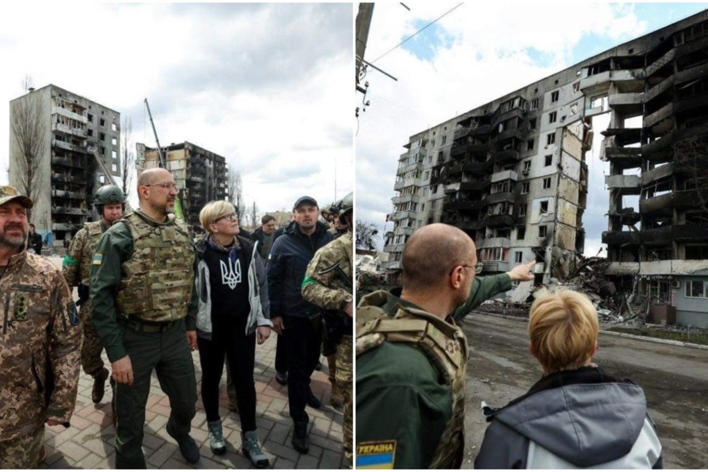 Vizitą premjerė pradėjo kartu su Ukrainos Vyriausybės vadovu Denysu Šmyhaliu apsilankydama Borodiankoje – Rusijos nuniokotame Kyjivo apskrities miestelyje.