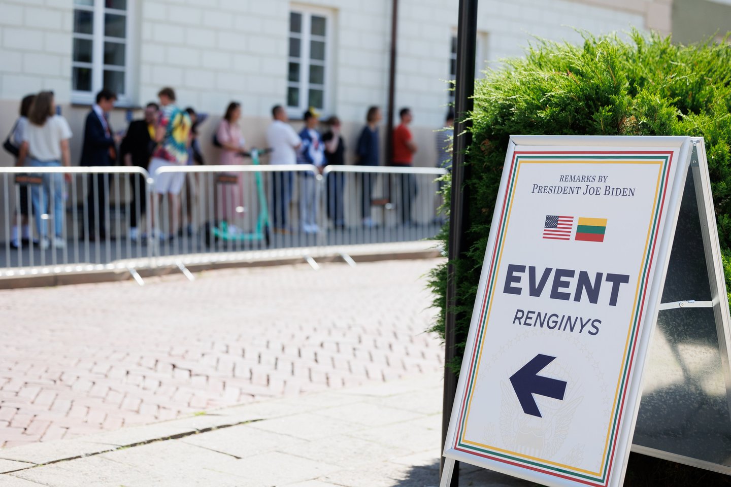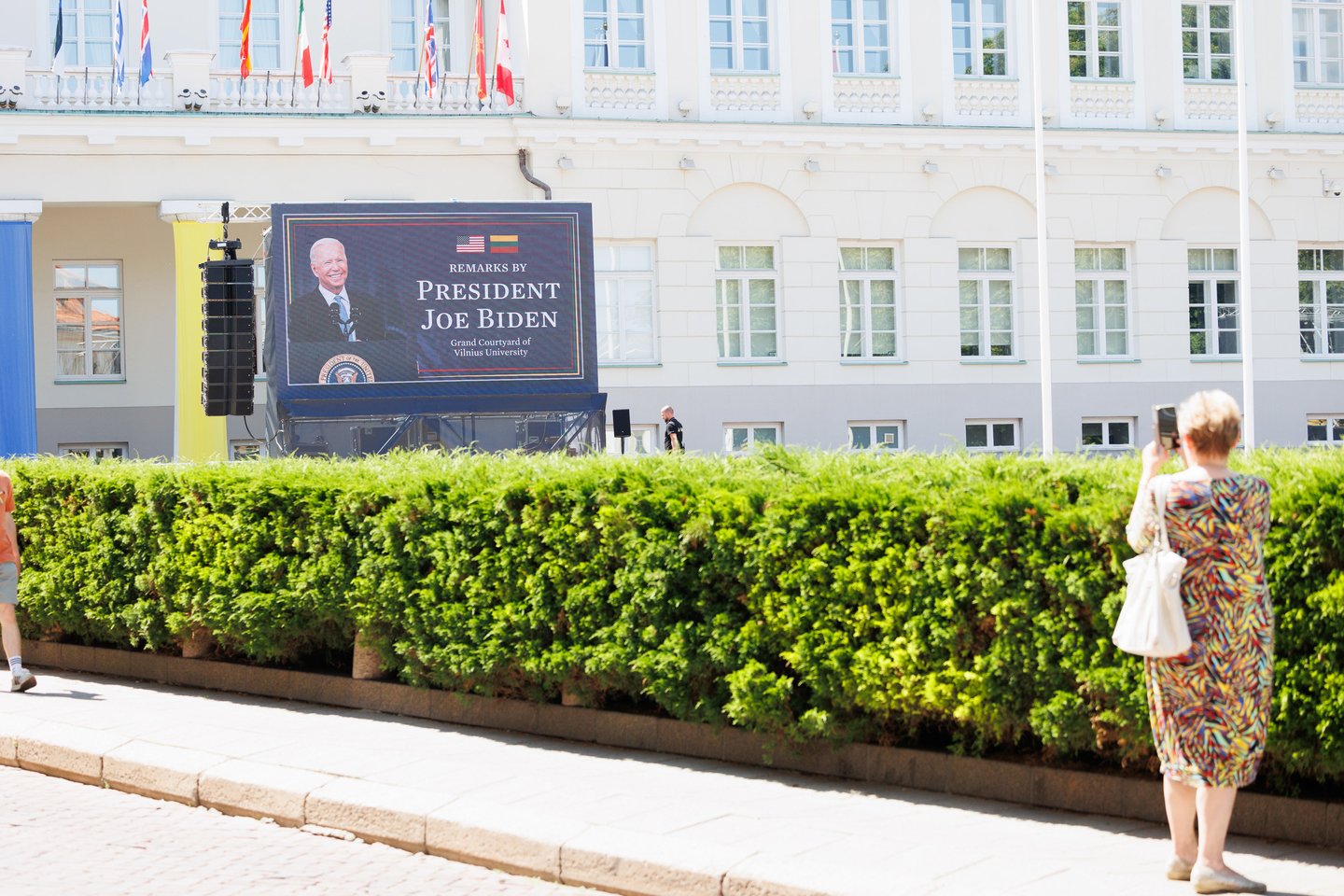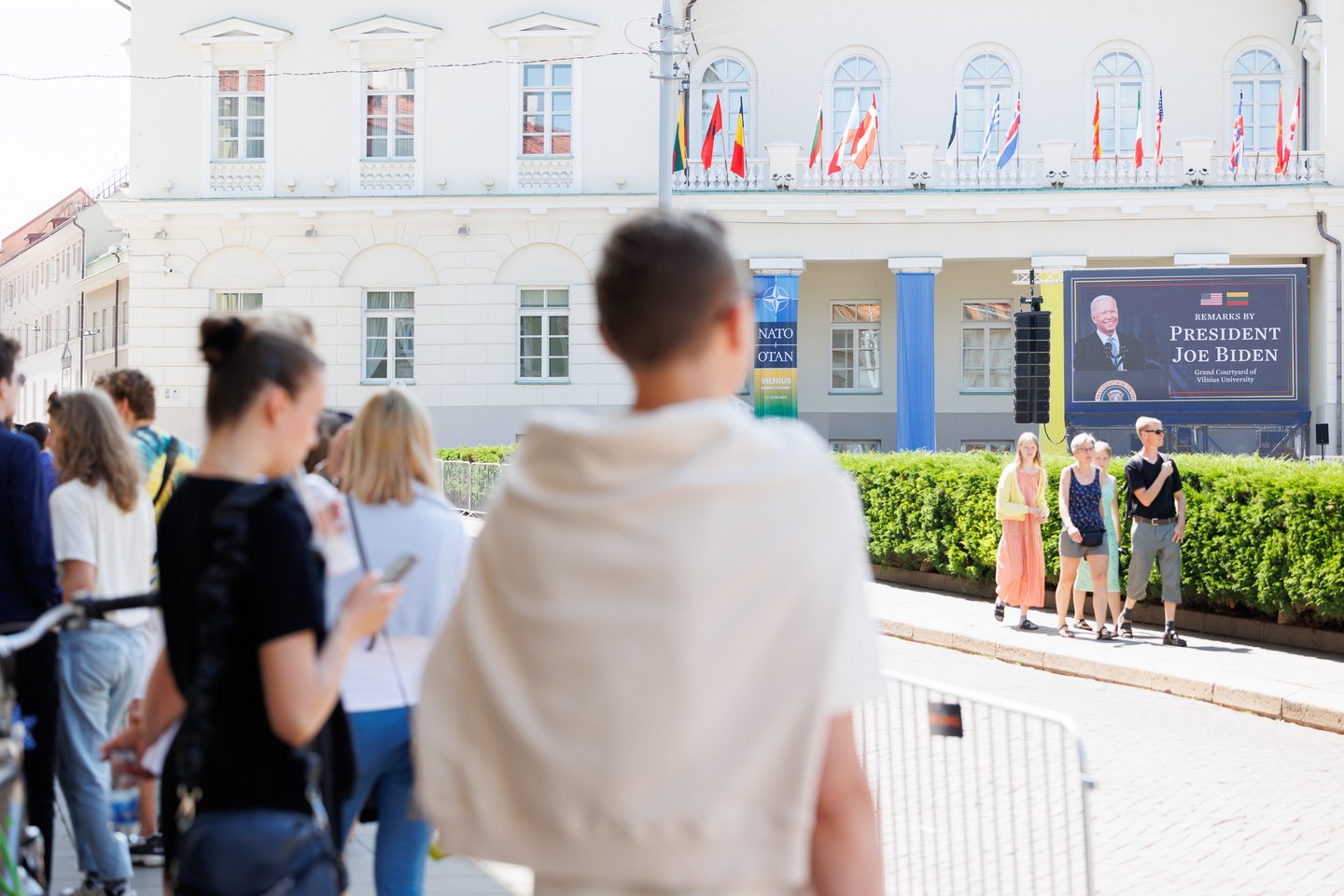 Trečiadienį po NATO viršūnių susitikimo JAV prezidentas Joe Bidenas kreipsis į lietuvius Vilniaus universiteto (VU) kiemelyje. Vartai laukiantiems J.Bideno kalbos bus atidaryti apie 16 val. 30 min., tačiau didžiulė eilė į kiemelį, kur vietų skaičius gana nedidelis, nusidriekė dar gerokai prieš. Žmonės čia jau rikiavosi nuo pietų. Neseniai pranešta, kad JAV prezidento kalbos naujas preliminarus laikas 19 val. 45 min.
