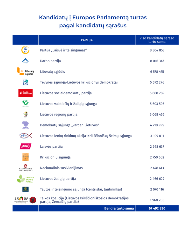 VRK duomenimis, šiemet rinkimuose dėl europarlamentaro pareigų varžysis 6 milijonieriai. Turtingiausias kandidatas yra Darbo partijos sąraše, 2 milijonierius turi partija „Laisvė ir teisingumas“, po vieną milijonierių yra Lietuvos socialdemokratų partijos, Liberalų sąjūdžio ir Lietuvos valstiečių ir žaliųjų sąjungos keliamuose kandidatų sąrašuose. Bendra visų kandidatuojančių asmenų disponuojamo turto suma – beveik 67,5 milijono eurų.