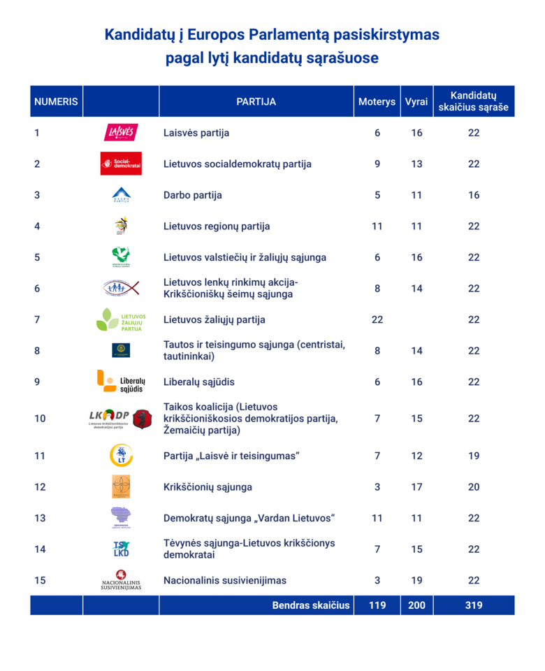 Lietuvos žaliųjų partijos kandidačių sąraše – 22 moterys. Daugiausiai vyrų (19) yra Nacionalinio susivienijimo kandidatų sąraše.