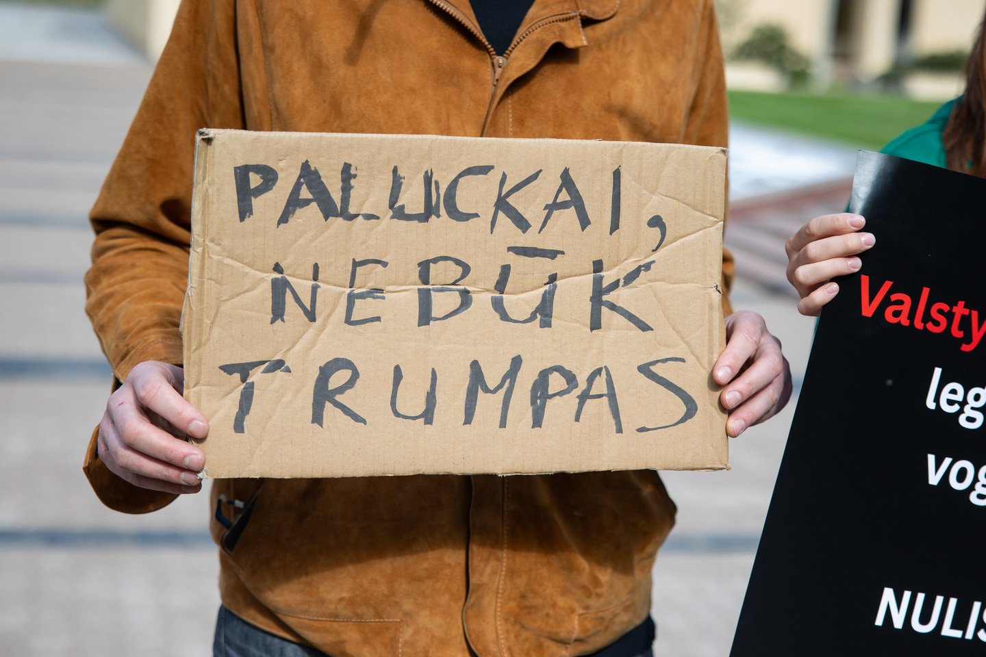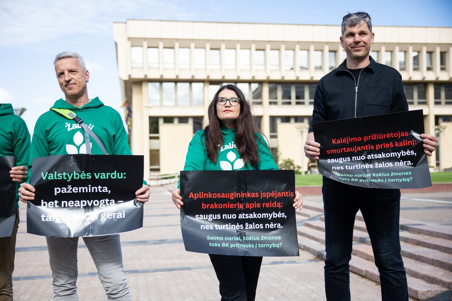 Pirmadienio rytą prie parlamento rūmų susirinkusi saujelė Lietuvos žaliųjų partijos (LŽP) atstovų taip pat siekė politikus įspėti, kad jų veiksmus visuomenė atidžiai stebi. Netoli Seimo išsirikiavo keli partijos nariai, rankose laikydami plakatus. Viename jų – raginimas G.Paluckui „nebūti D.Trumpu“.