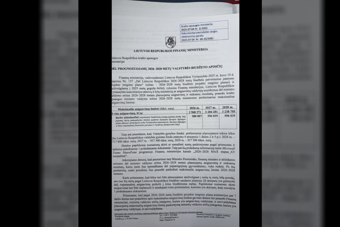 Tuo metu kitame dokumente, kuris jau turėjo būti pristatytas naujojo finansų ministro spalio pradžioje, galima pamatyti, kad planuojami KAM asignavimai (įskaitant Valstybės gynybos fondą) 2026 metams yra 4,87 proc. BVP arba 4,3 mlrd. eurų, šalia numatant 155 mln. eurų – „kitų asignavimų valdytojų išlaidos gynybai“. Bendra numatyta išlaidų suma – 5 proc. BVP.