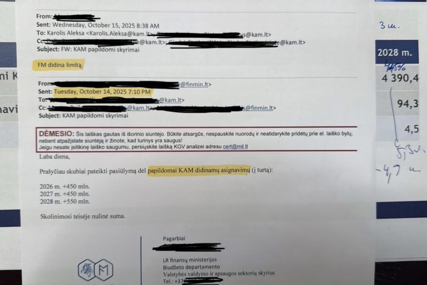 D.Šakalienė paviešino ir elektroninius laiškus, kuriuose užfiksuota, kad spalio 14 dieną, 19 valandą vakaro Finansų ministerija skubiai prašo Krašto apsaugos ministerijos pateikti siūlymą dėl papildomai didinamų KAM asignavimų į turtą.