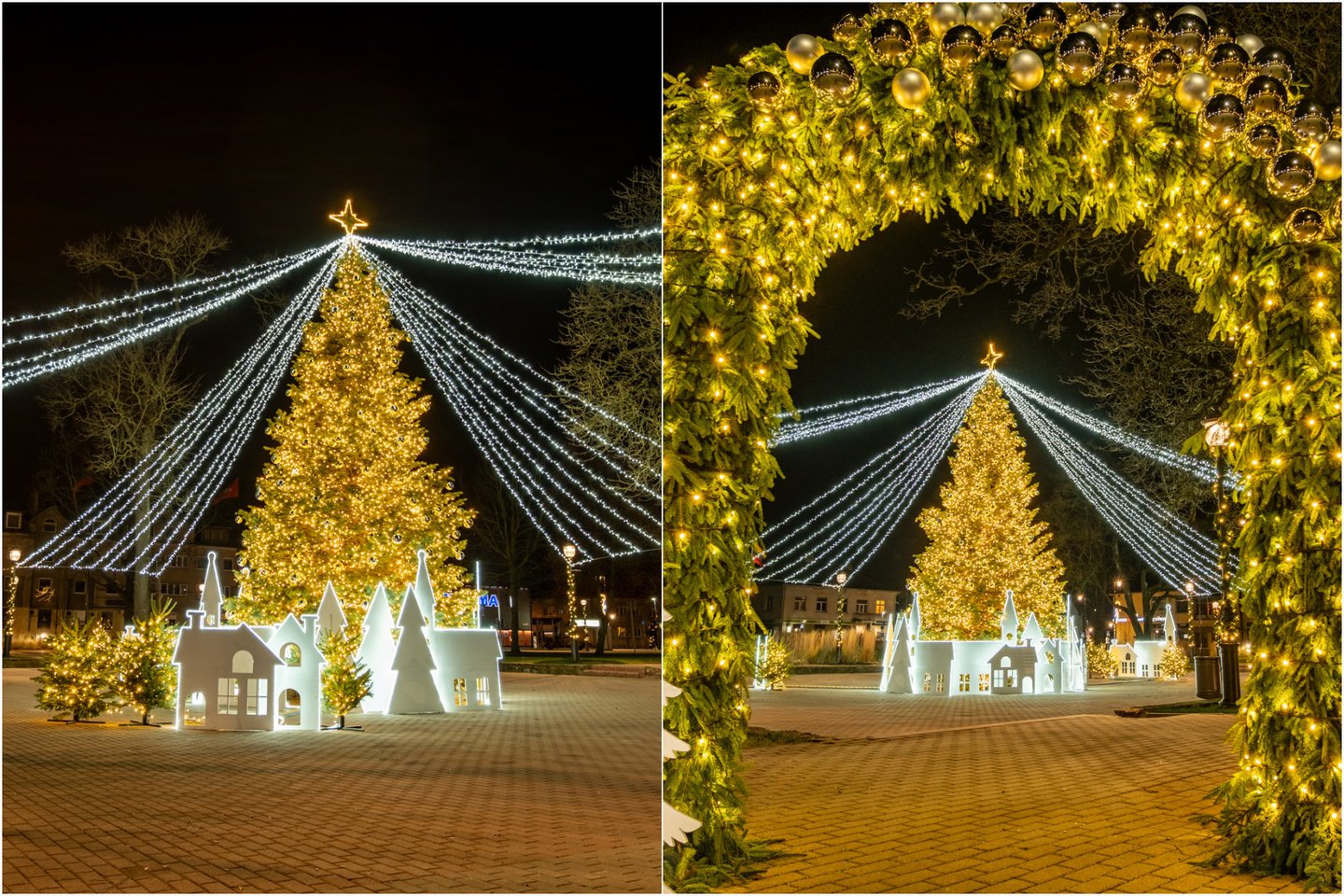 Kretingiškiai jau ketvirtą kartą įžiebė pačių gyventojų dovanotą natūralią eglę, šiemet ji – kretingiškio Dovydo Gaidjurgio dovana. Kalėdų medį puošia net 20 iš tūkst. lempučių girlianda, pasakišką vaizdą kuria ir LED blykstės bei 200 aukso bei sidabro spalvos rutulio formos žaislų. O žengti į šventišką erdvę kviečia spindintys vartai, prie kurių pasitinka lyg iš miško pasakos atšuoliavę išdidūs elniai.