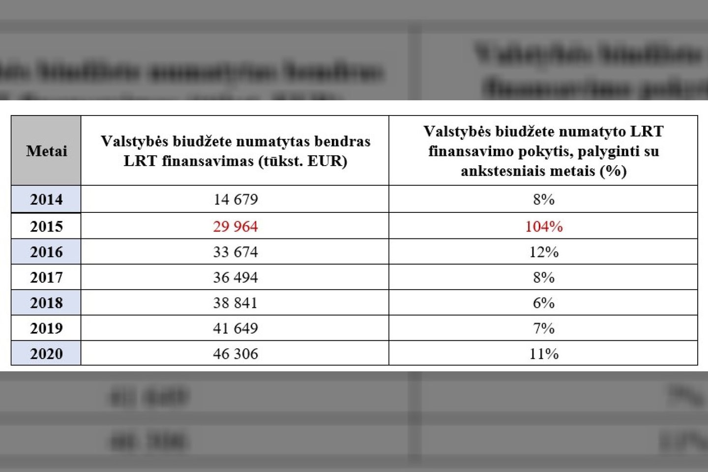 · Nors faktiškai valstybės skiriamos LRT lėšos 2015 m., palyginti su 2014 m., padidėjo 49,9 %, valstybės biudžete numatytas LRT finansavimas augo sparčiau. Skirtumą lėmė tai, kad nuo 2015 m. pasikeitus LRT finansavimo modeliui (uždraudus reklamą) ir didžiąją finansavimo naštos dalį perkėlus į valstybės biudžetą, biudžete numatytas bendras LRT finansavimas, palyginti su 2014 m., padidėjo 104 %, kaip matyti žemiau pateiktoje lentelėje.