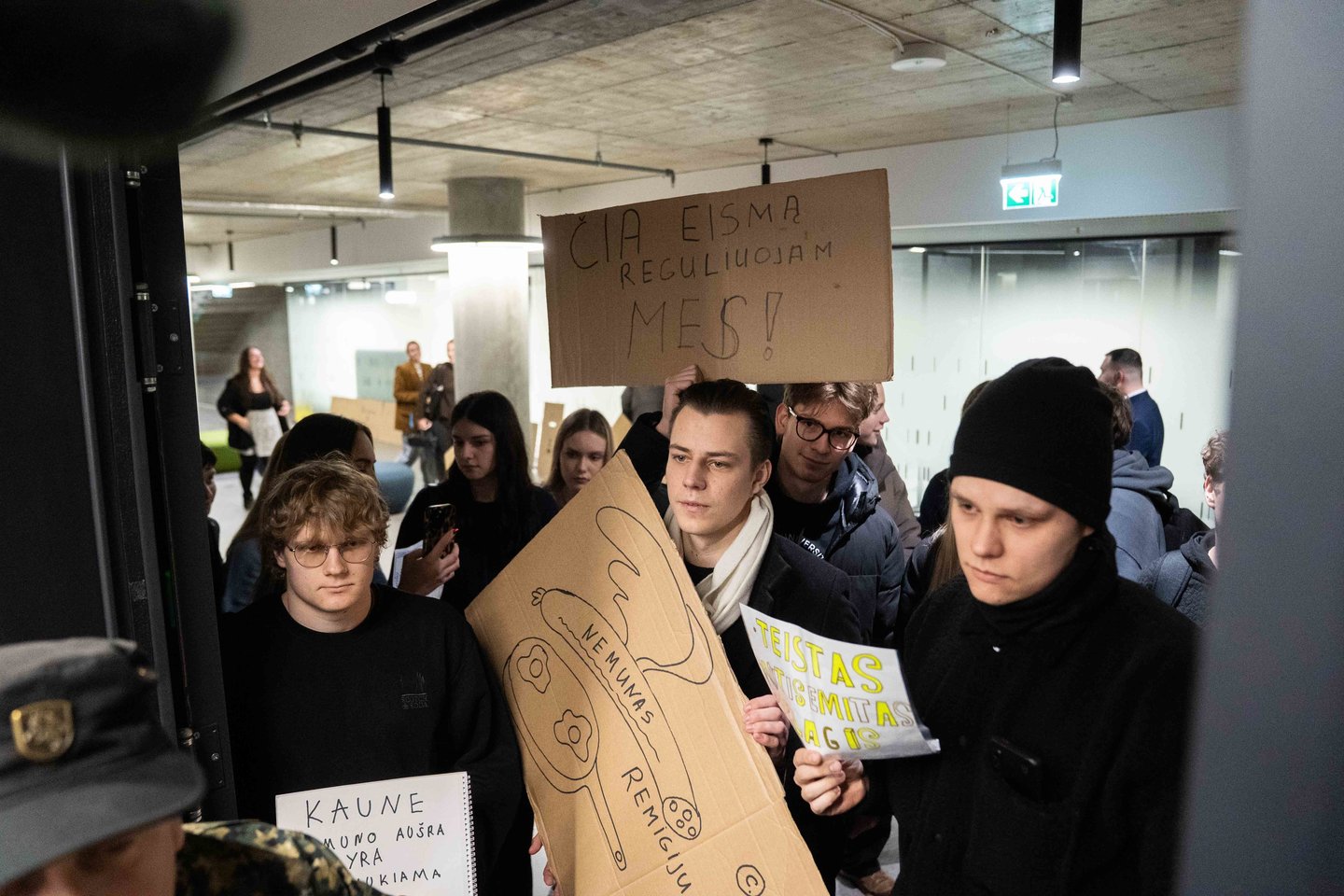 Kai renginys prasidėjo, durys buvo užvertos, bet dalis jaunuolių toliau liko stovėti. Keli jų, kurie sutiko palikti plakatus už durų, buvo įleisti į salę.