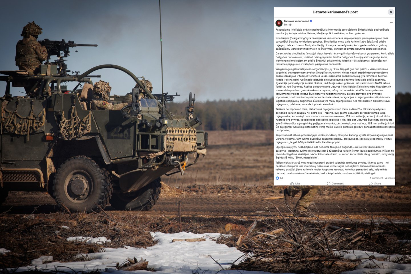 Sąjungininkų ryžtu neabejojame, nes neturime tam jokio pagrindo – iki šiol visi veiksmai buvo pasakyta – padaryta, turime dislokuotus per 3 tūkstančius karių ir šiemet laukia papildymas. Ir šiaip, tik įsivaizduoti galima Vokietijos, JAV ar kitos šalies kario, su kuriuo kartu išlieta daug prakaito, motyvaciją, išgirdus iš mūsų „žinok, nepasitikim“, – rašė Lietuvos kariuomenė.