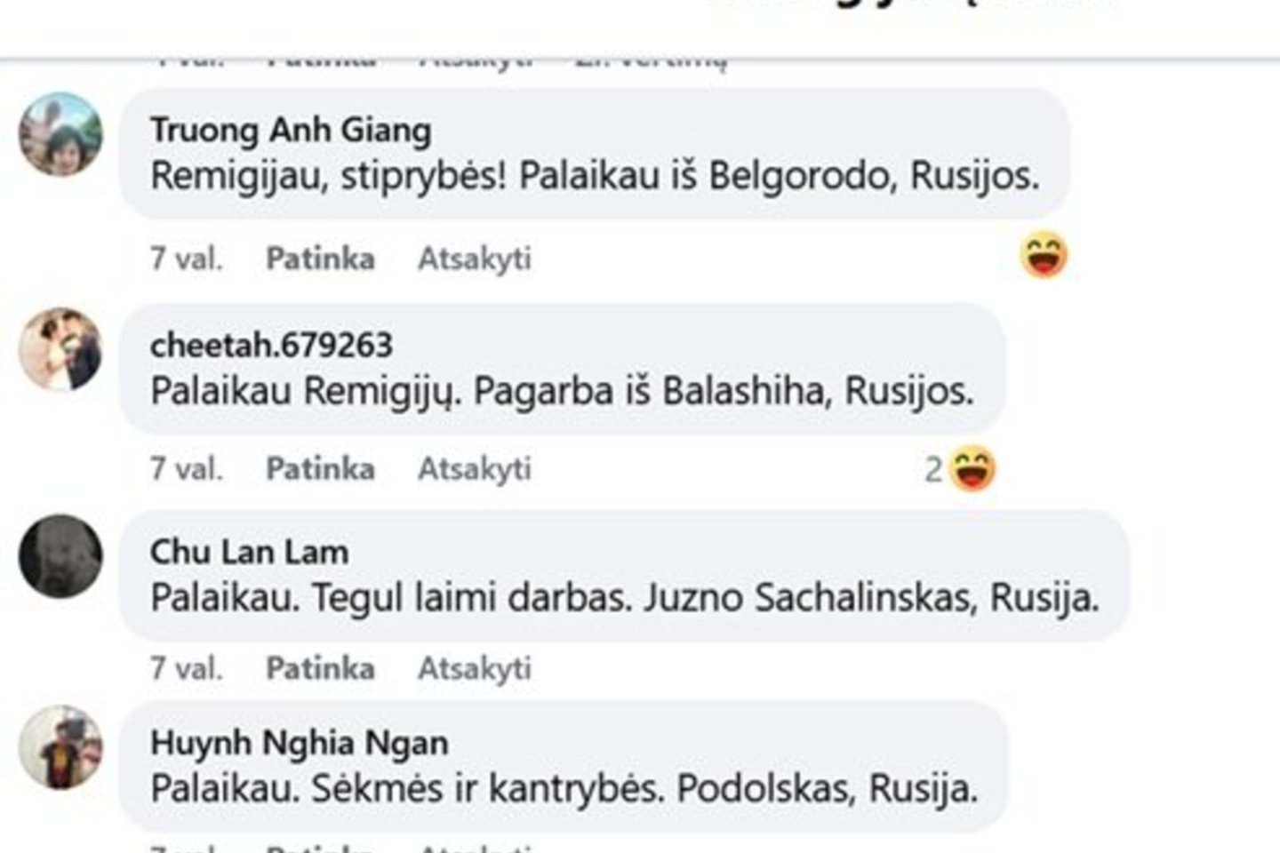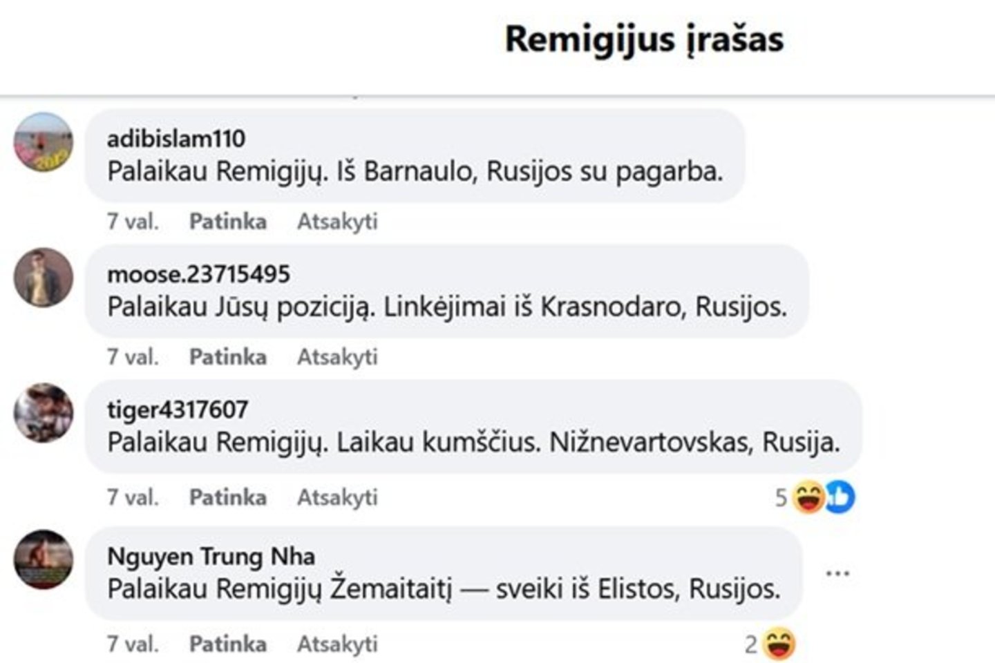 Dalis komentuojančiųjų – veikiausiai, botai – R. Žemaitaičiui siuntė linkėjimus iš Rusijos: „Remigijau, stiprybės! Palaikau iš Belgorodo, Rusijos“, „Palaikau Remigijų. Parama iš Balashiha, Rusijos“, „Palaikau. Sėkmės ir kantrybės. Podolskas, Rusija“ ir pan.