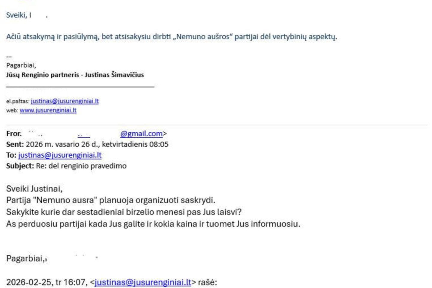 „Ačiū už atsakymą ir pasiūlymą, bet atsisakysiu dirbti „Nemuno aušros“ partijai dėl vertybinių aspektų“, – į pasiūlymą atsakė renginių vedėjas.