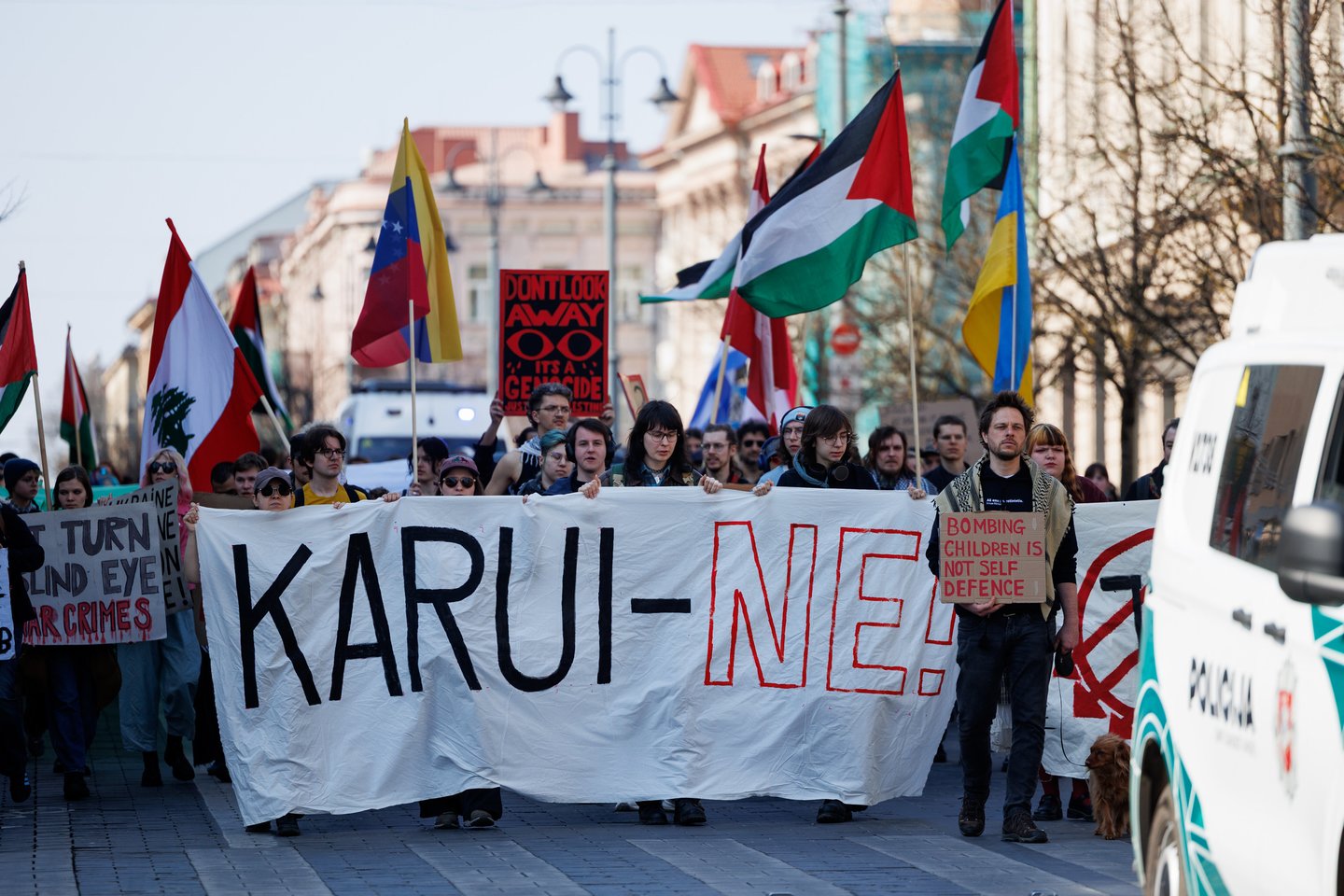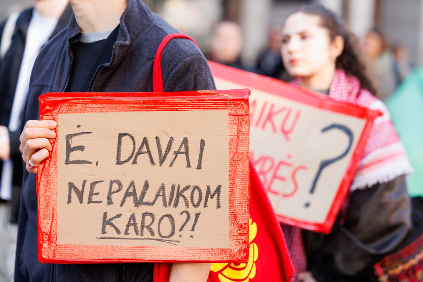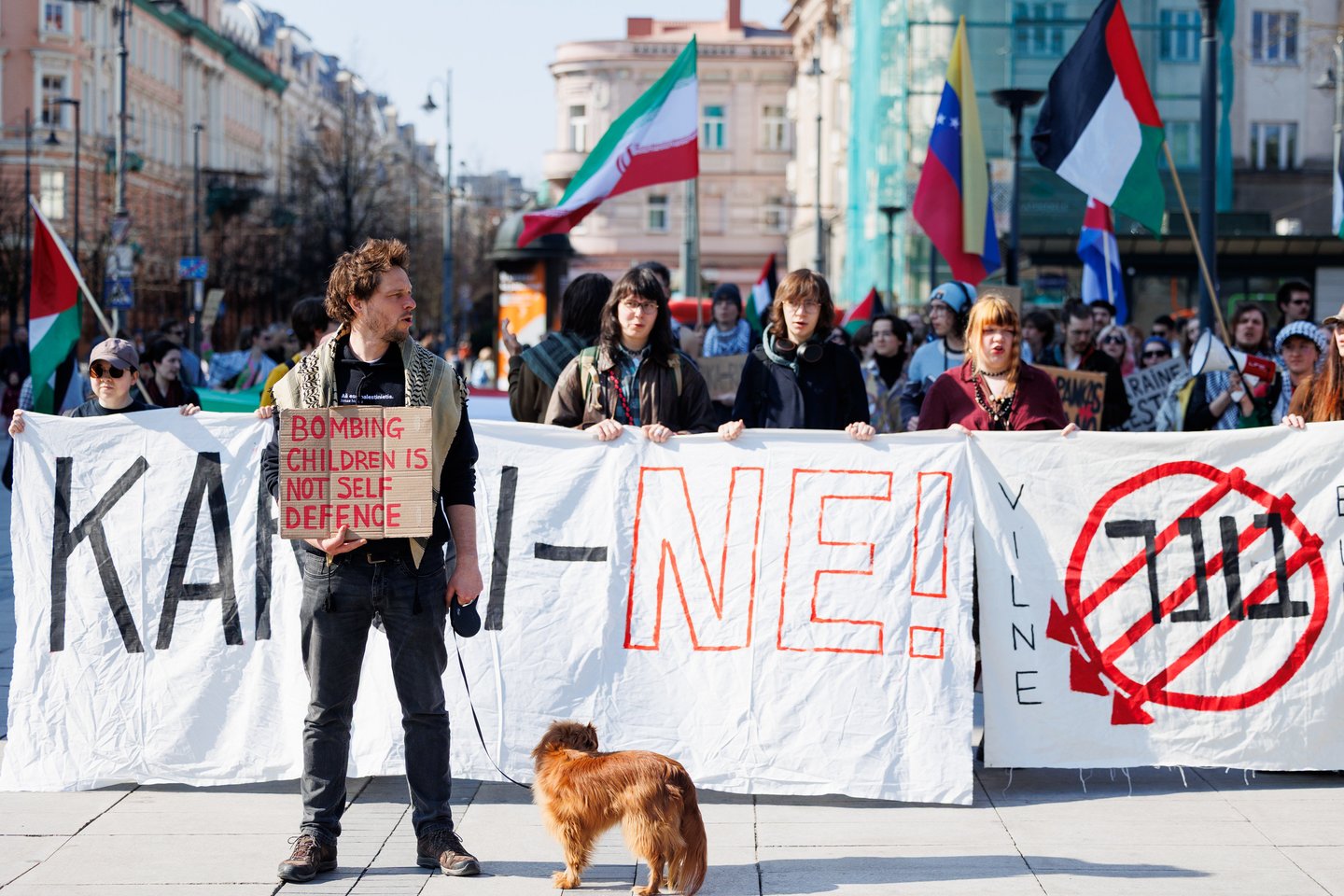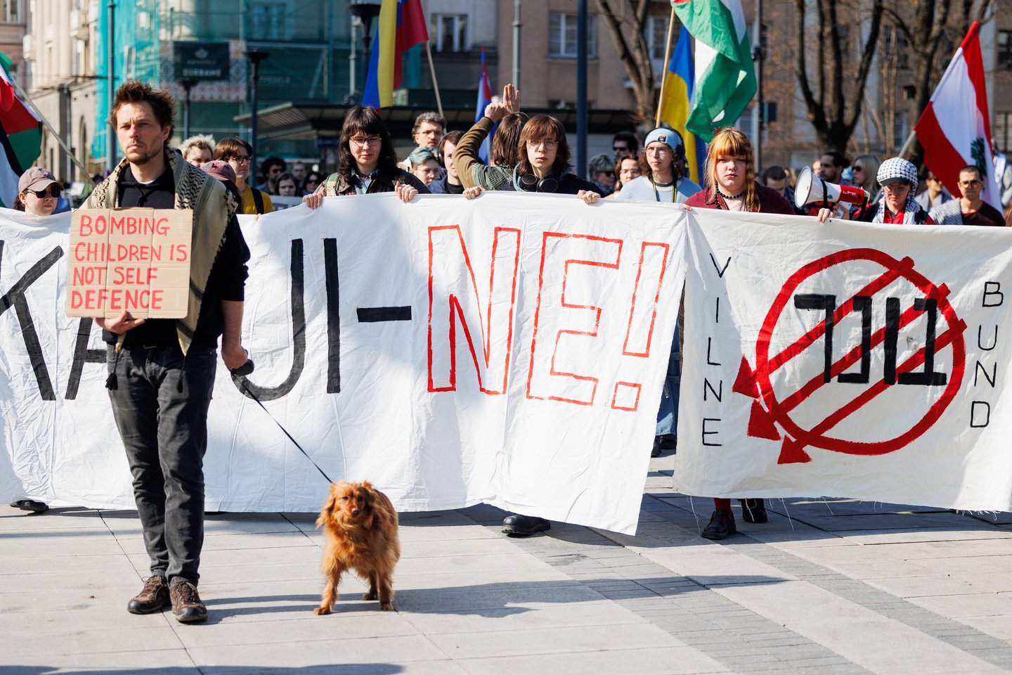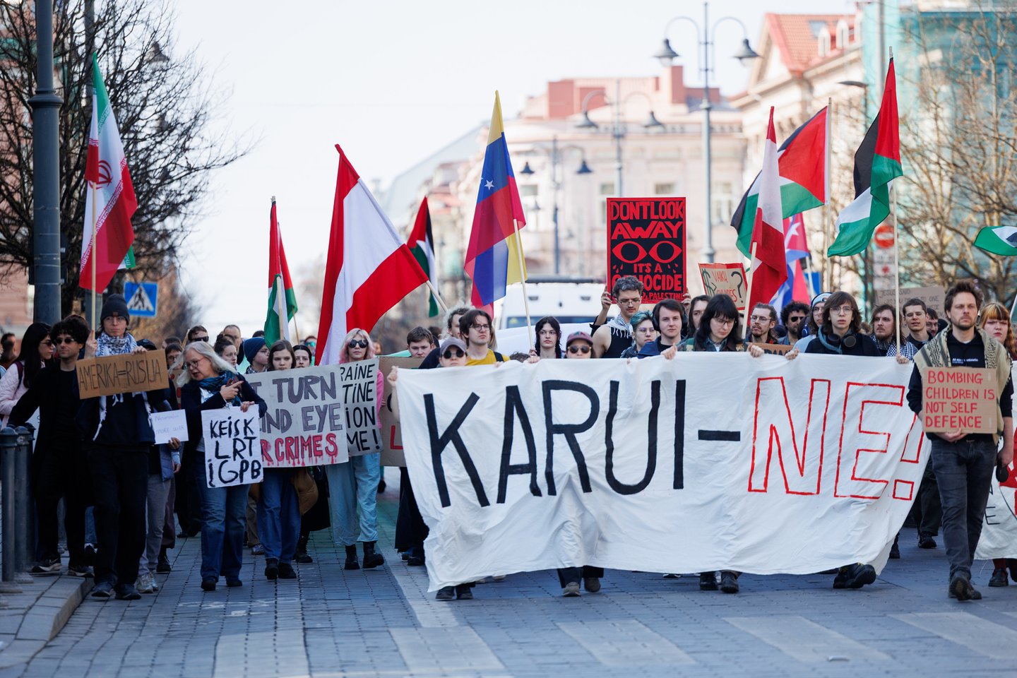 Po vidurdienio šeštadienį Vilniuje prasidėjo protestas – eitynės prieš Lietuvos bendradarbiavimą Izraelio ir JAV karuose. Protesto šūkis – „Karui – NE!“. Protesto dalyviai prieš 13 valandą pradėjo rinktis Vinco Kudirkos aikštėje Vilniuje, nuo kur eisena pajudės link Rotušės aikštės. Protesto akimirkas užfiksavo portalo Lrytas fotografas Tomas Bauras.