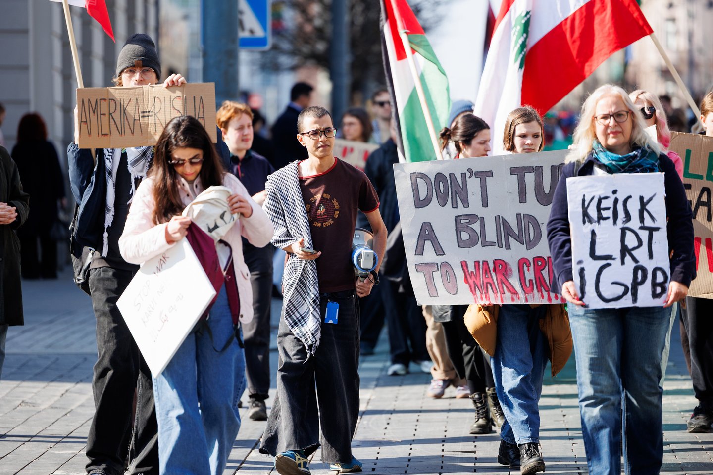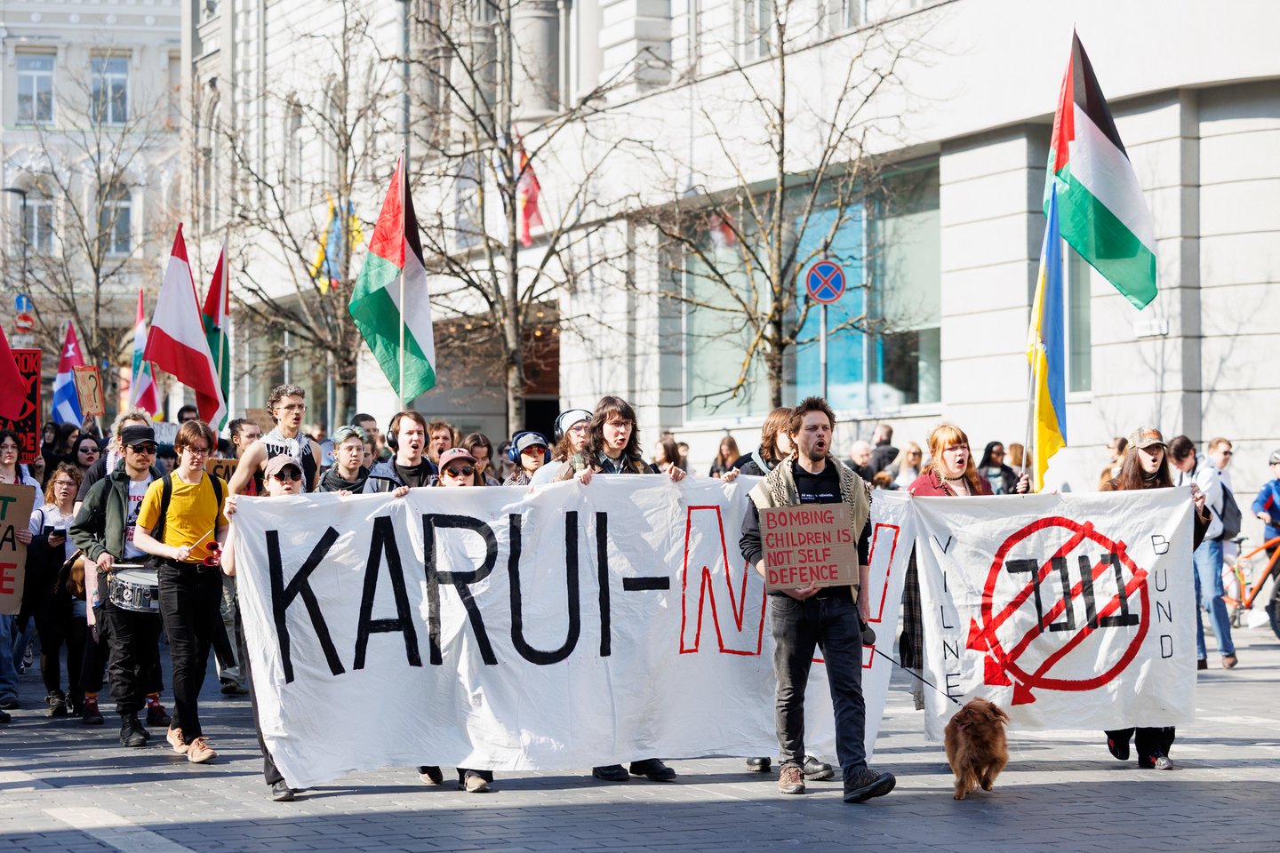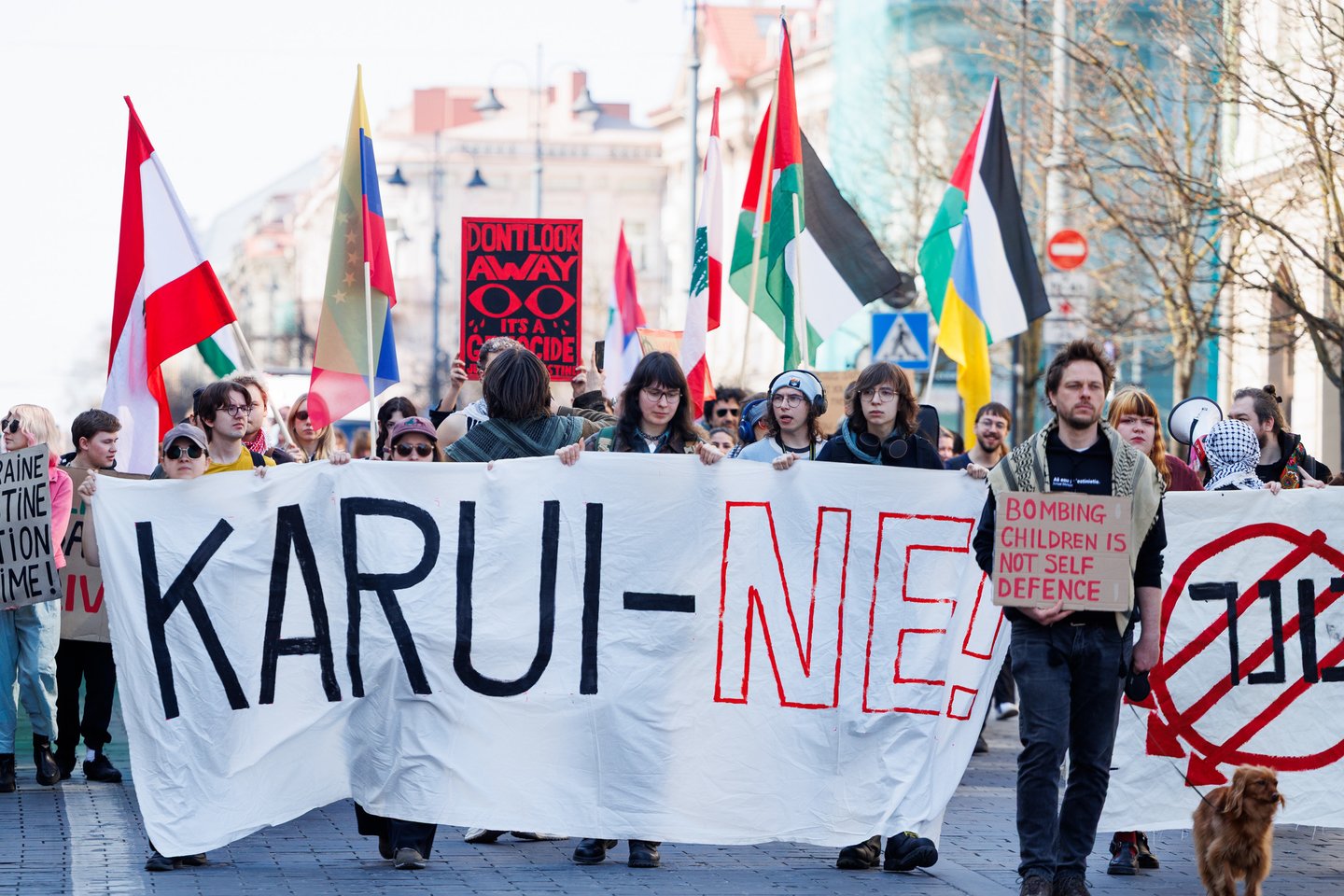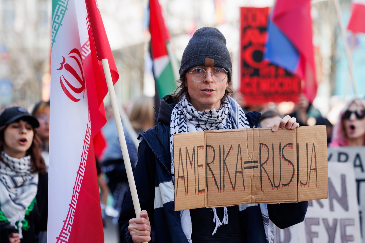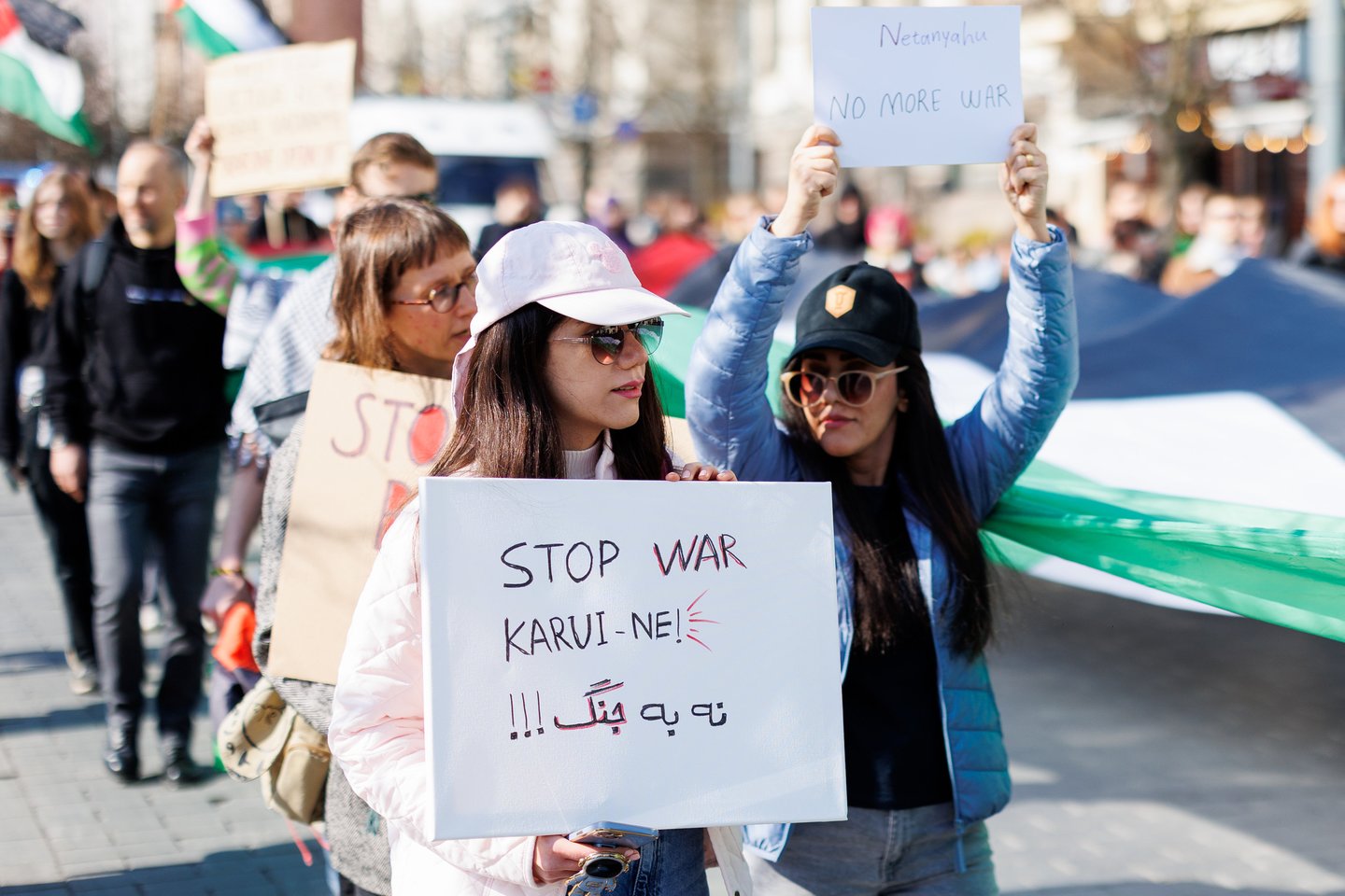 Po vidurdienio šeštadienį Vilniuje prasidėjo protestas – eitynės prieš Lietuvos bendradarbiavimą Izraelio ir JAV karuose. Protesto šūkis – „Karui – NE!“. Protesto dalyviai prieš 13 valandą pradėjo rinktis Vinco Kudirkos aikštėje Vilniuje, nuo kur eisena pajudės link Rotušės aikštės. Protesto akimirkas užfiksavo portalo Lrytas fotografas Tomas Bauras.