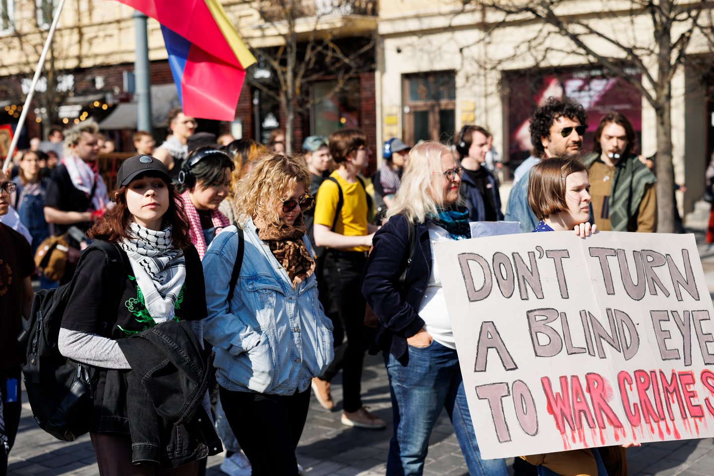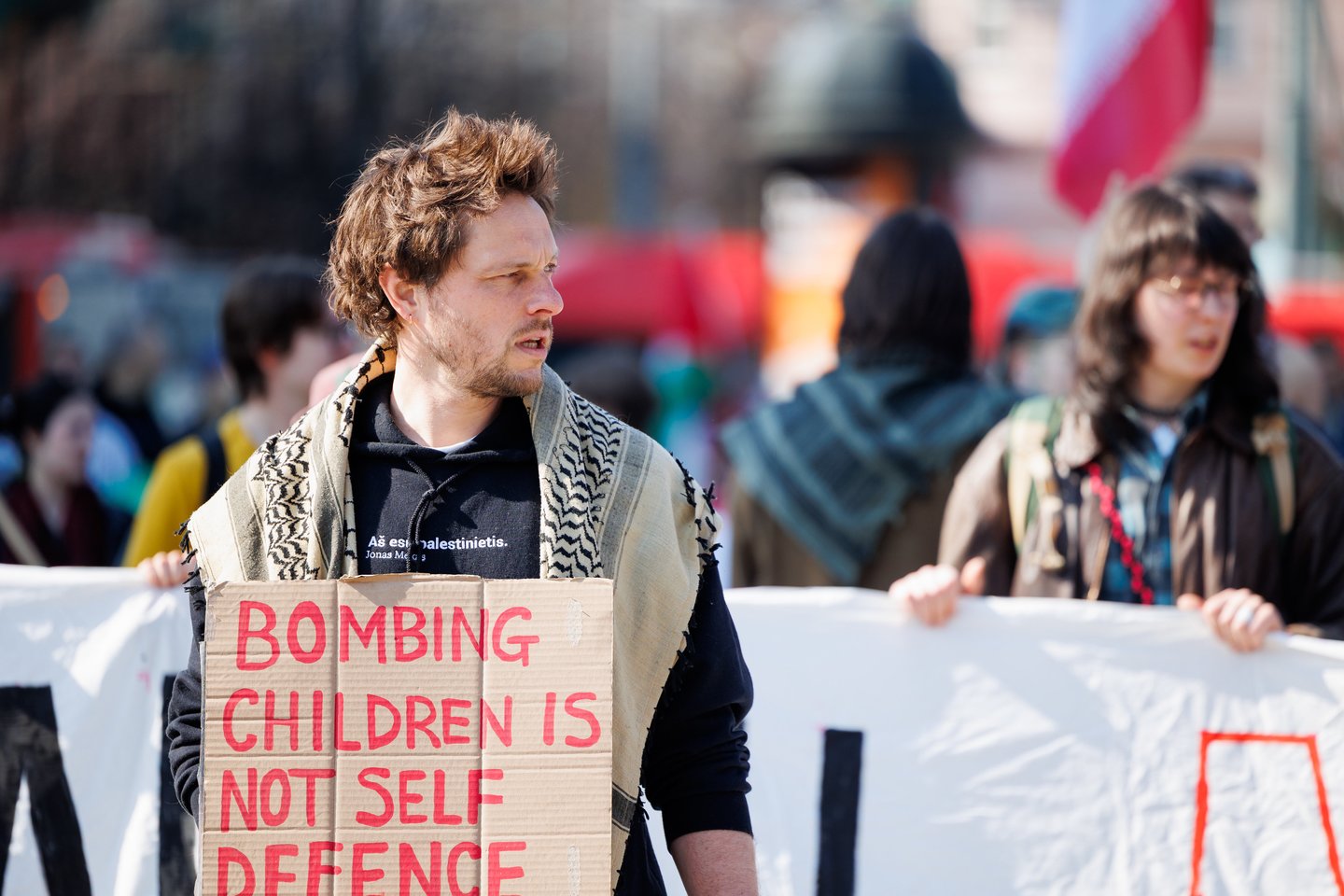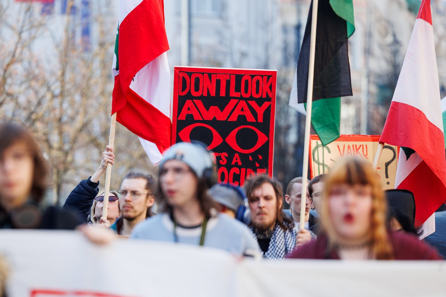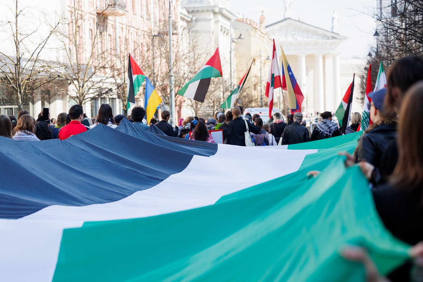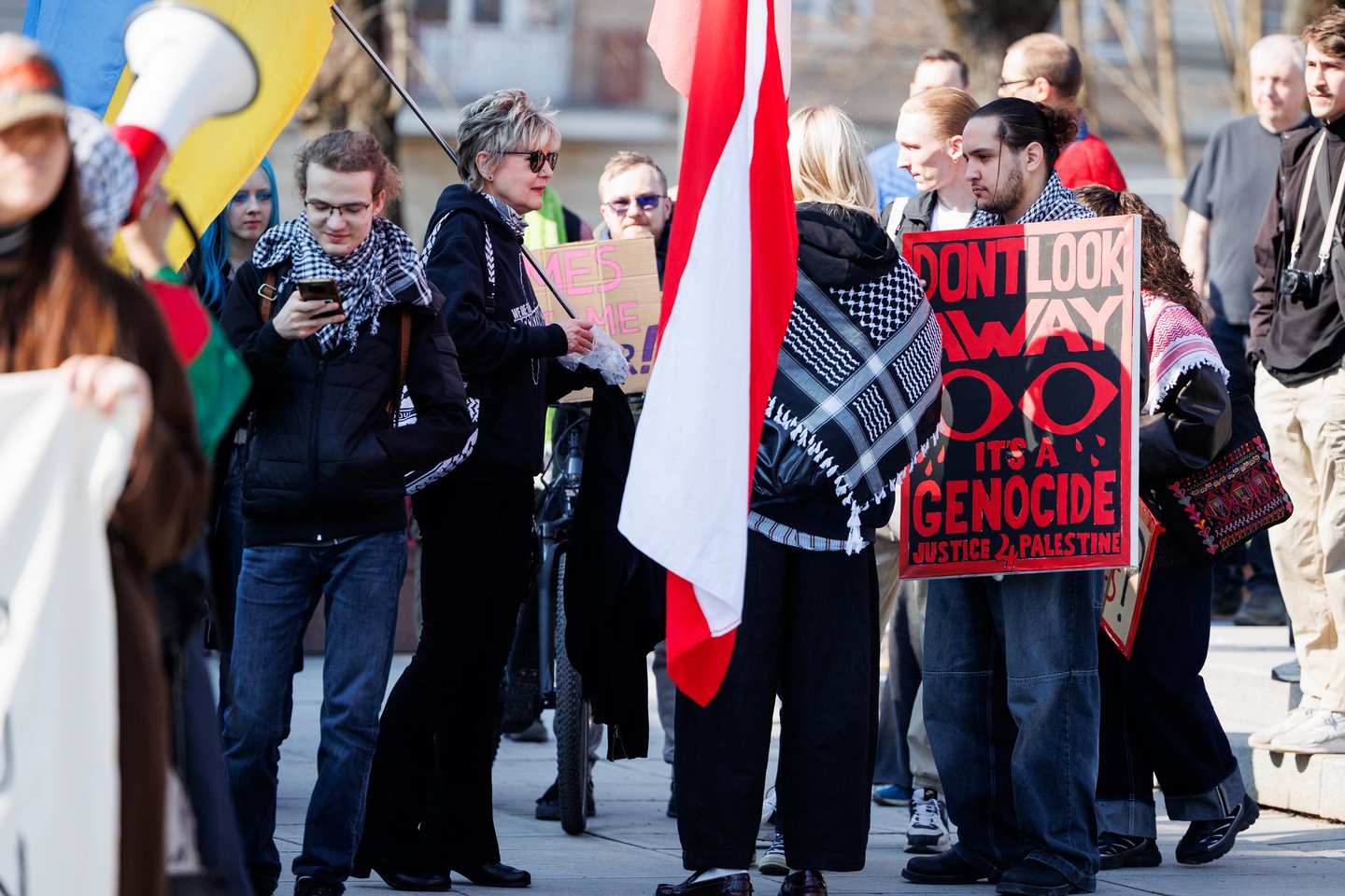 Po vidurdienio šeštadienį Vilniuje prasidėjo protestas – eitynės prieš Lietuvos bendradarbiavimą Izraelio ir JAV karuose. Protesto šūkis – „Karui – NE!“. Protesto dalyviai prieš 13 valandą pradėjo rinktis Vinco Kudirkos aikštėje Vilniuje, nuo kur eisena pajudės link Rotušės aikštės. Protesto akimirkas užfiksavo portalo Lrytas fotografas Tomas Bauras.