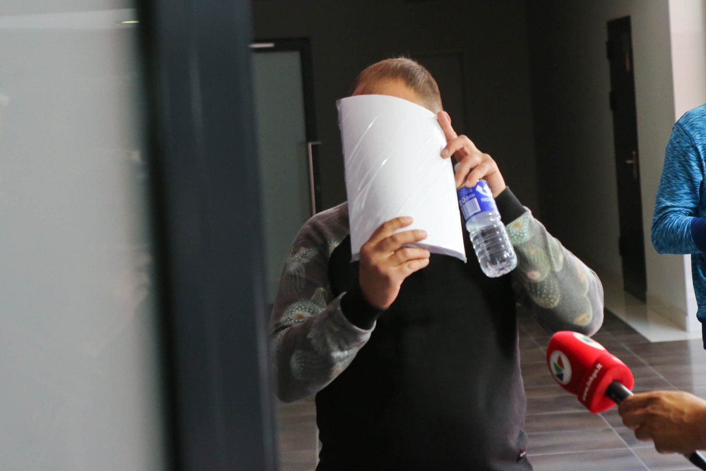 Į teismo posėdį atvykęs A.Stiklioraitis atkakliai dangstė veidą storu popieriaus pluoštu prieš fotoobjektyvus – jo neatitraukė net klausinėjamas posėdžių sekretorės.