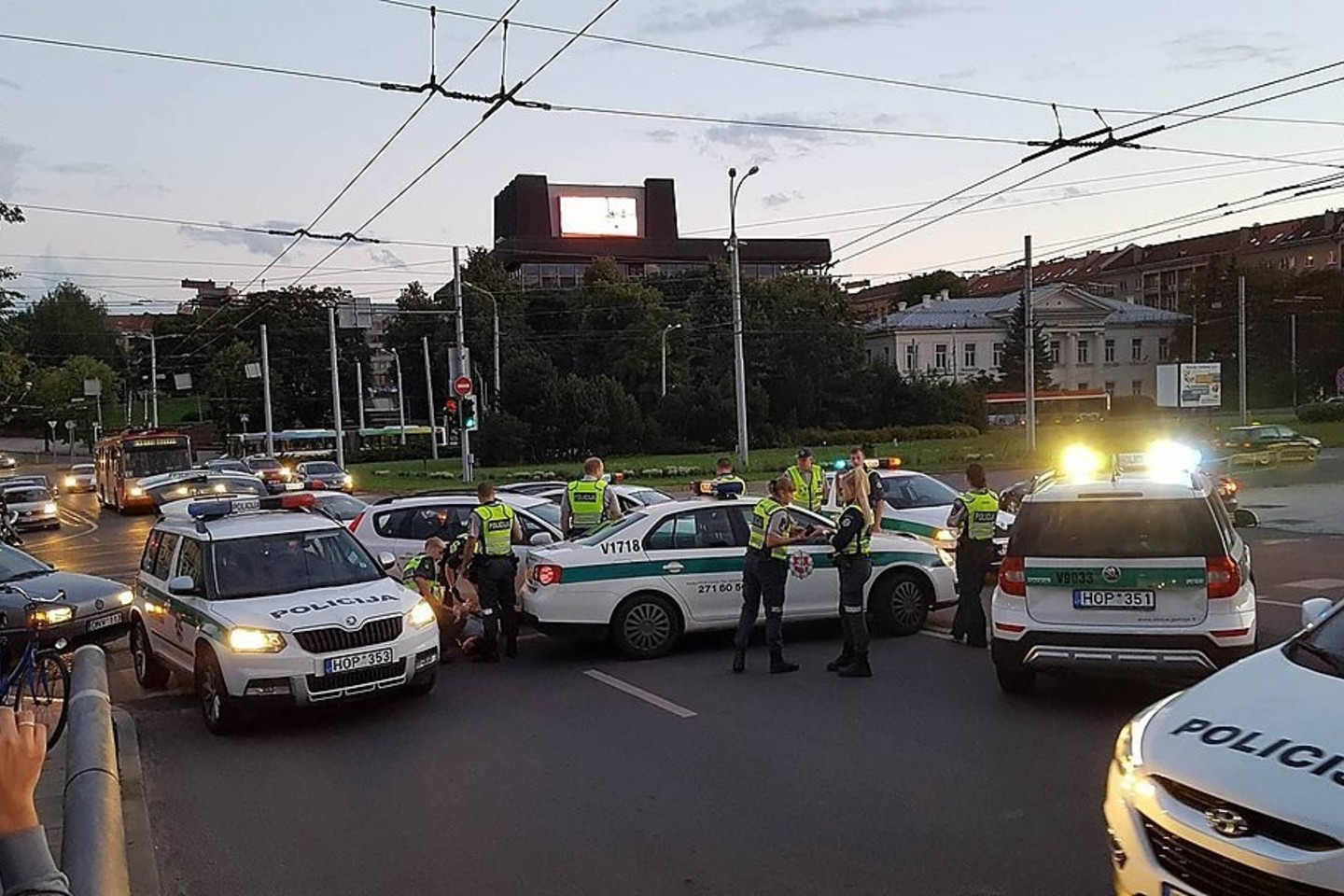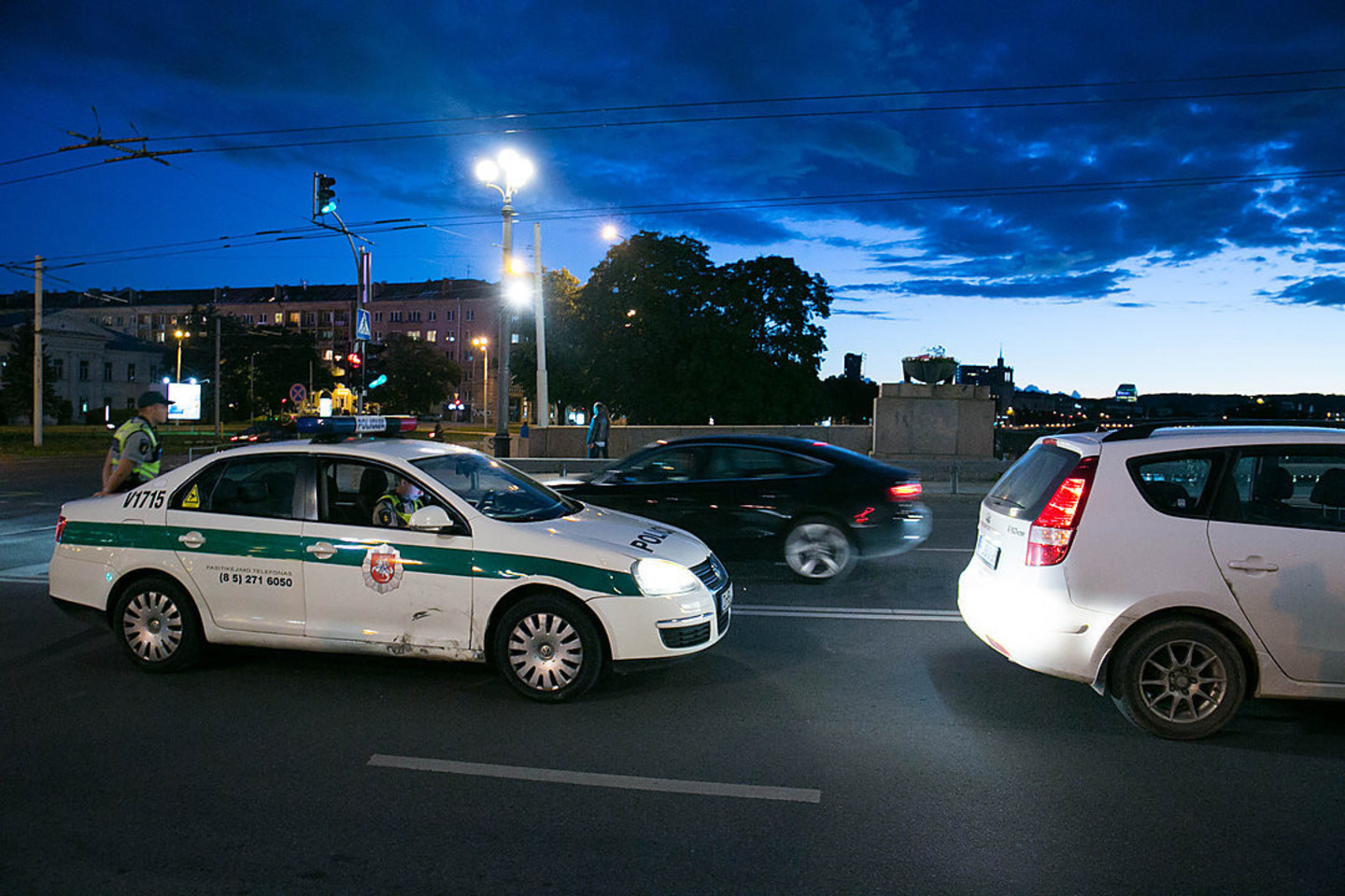 Policijos ekipažas blokavo sankryžos dalį, kurioje pažeidėjas turėjo nuvažiuoti nuo šaligatvio. Vairuotojas sustojo tik atsitrenkęs į tarnybinio policijos automobilio „Volkswagen Jetta“ šoną.