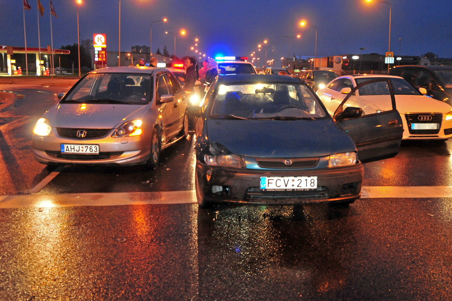 „Mazda“ įčiuožė į tarpą tarp „Audi“ ir „Honda“ ir abu automobilius apgadino. Apdaužytas ir avarijos kaltininko automobilis.