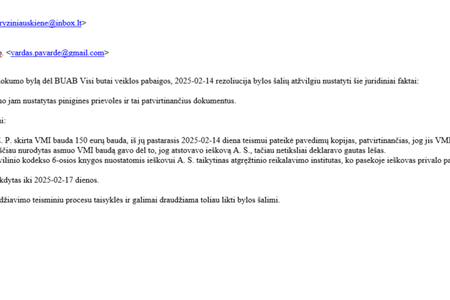 Atkreipiamas dėmesys į tai, kad Klaipėdos apygardos teismas niekada nesiunčia gyventojams el. laiškų su nurodymais sumokėti išlaidas, nes baudos, bylinėjimosi išlaidos yra priteisiamos teismo nutartimis, sprendimais.