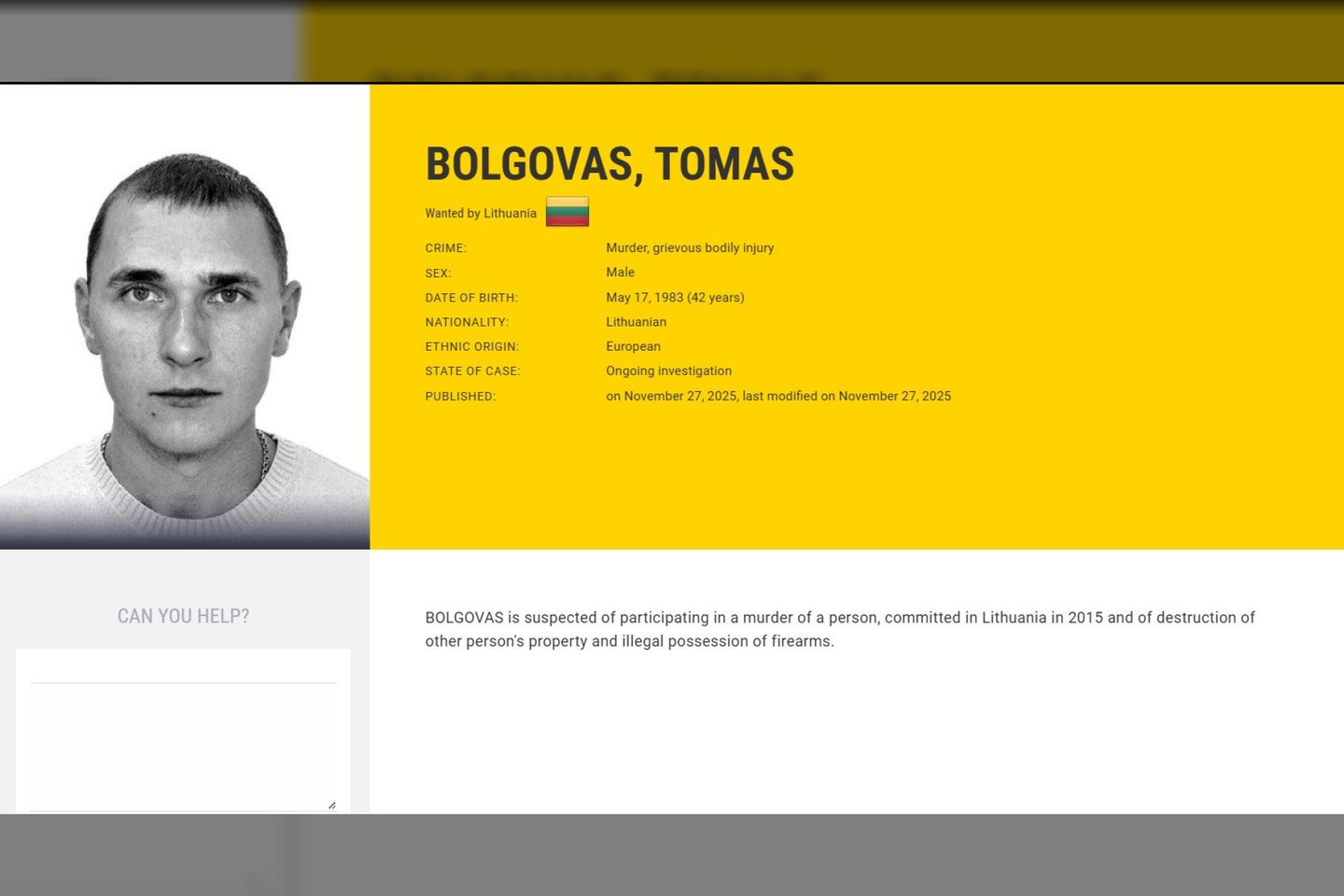 Tomas Bolgovas (gim. 1983 m.) į ieškomiausiųjų sąrašą įtrauktas pernai. Europolas skelbia, kad vyras yra įtariamas nužudymu ir sunkiu kūno sužalojimu.