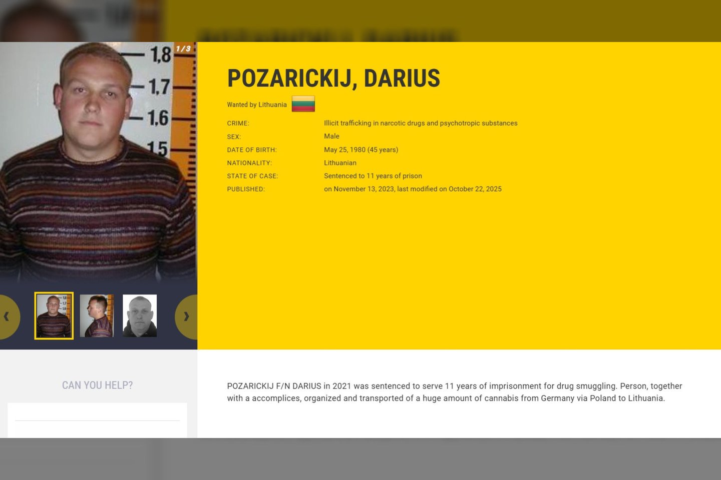 Dariušas Požarickis (gim. 1980 m.) ieškomiausiųjų Europos nusikaltėlių sąraše atsidūrė 2023 m. lapkričio 13 d. Europolas skelbia, kad jis dar 2021 m. buvo nuteistas 11 m. laisvės atėmimo bausme dėl narkotikų kontrabandos organizavimo, tačiau pasislėpė.