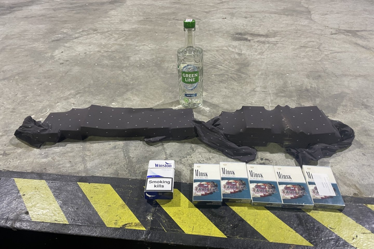 Po striuke slėpti 5 pakeliai „MINSK“, o prie juosmens – pėdkelnės, pilnos „NZ“ cigarečių.