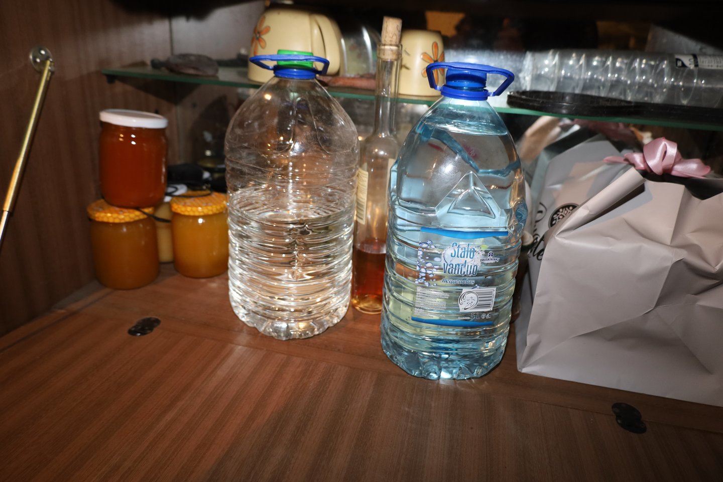 Kratos pas moterį metu rasta ir paimta du pilni 0,5 litro talpos buteliukai, pilnas 3 litrų talpos plastikinis butelis bei nepilni 3 ir 5 litrų talpos plastikiniai buteliai su degtinės kvapo skysčiu.