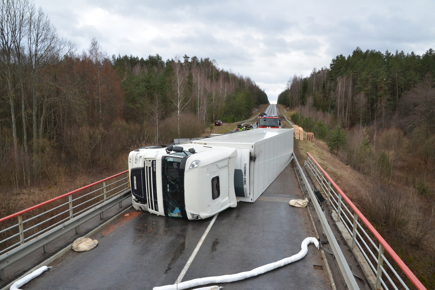 Lrytas.lt duomenimis, eismas užblokuotas dėl apvirtusio vilkiko. Jis užtvėrė kelio važiuojamąją dalį. Avarijoje sužaloti du žmonės.