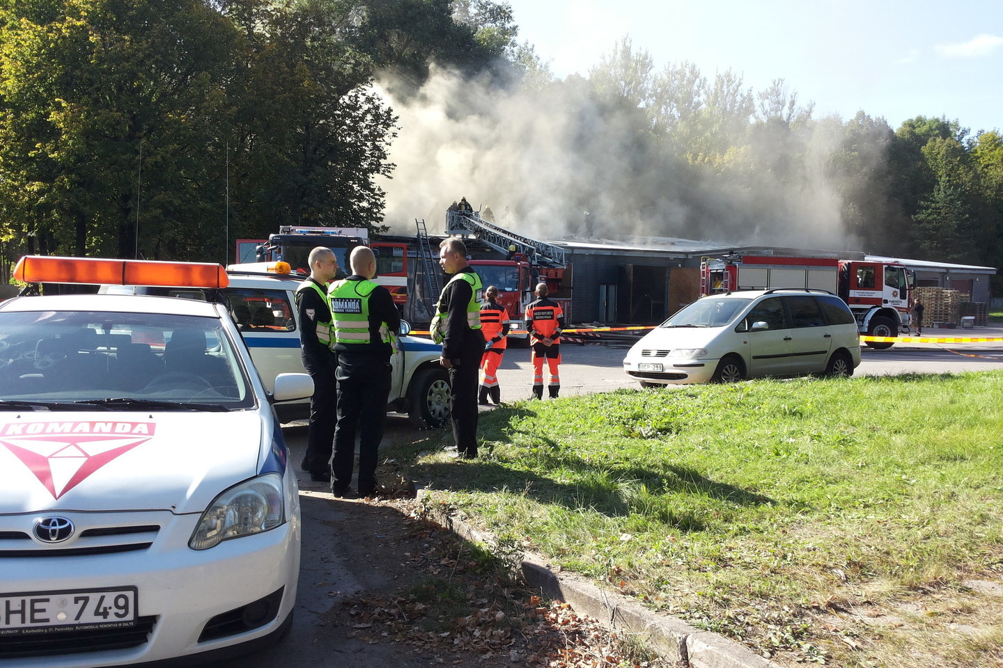 Gaisrą gesinantys ugniagesiai vandenį ima iš šalia, vos už keliasdešimties metrų esančio vandens telkinio. Iškvietimas buvo gautas apie 13 valandą. 14 valandą 30 minučių ugniagesiai dar tebedirbo