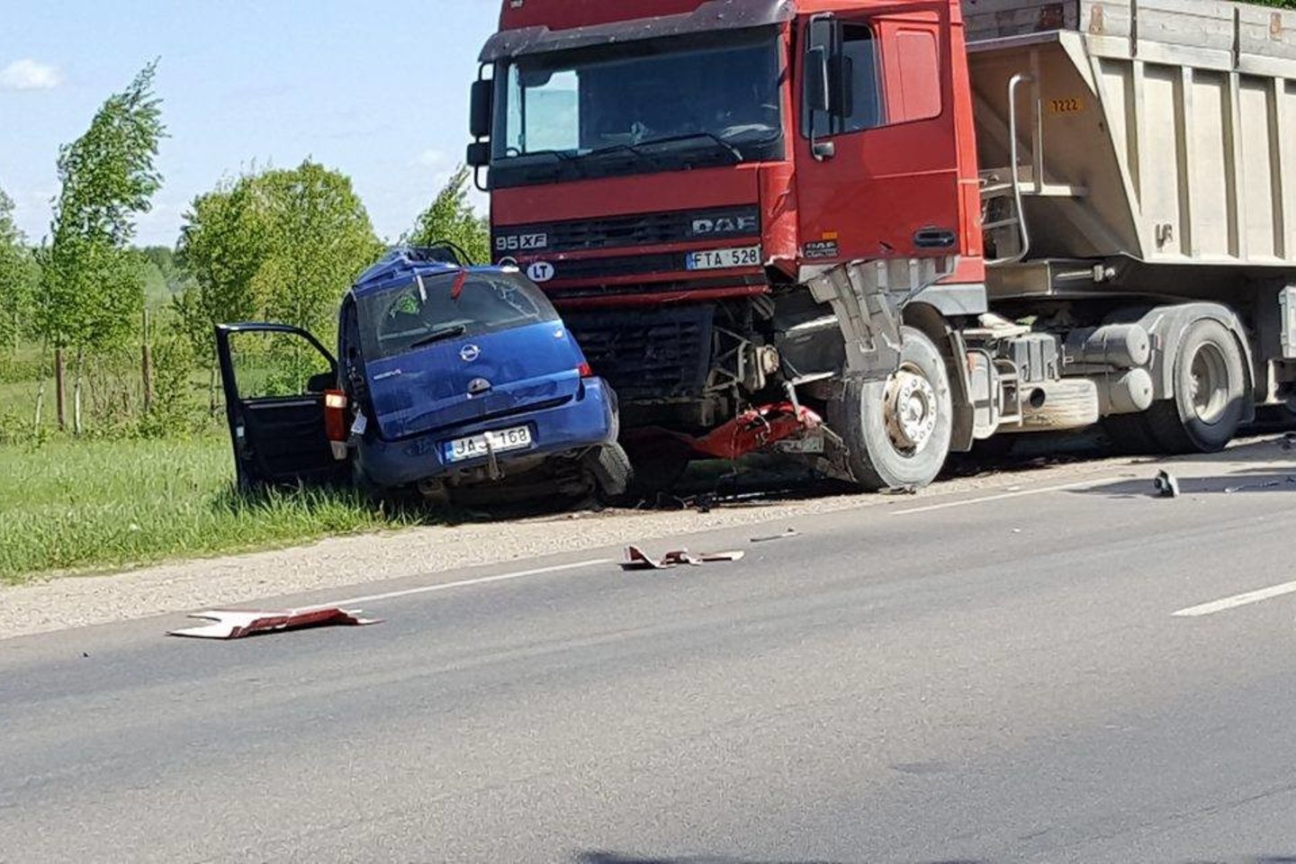 Priešgaisrinės apsaugos ir gelbėjimo departamente lrytas.lt sužinojo, kad atvykę ugniagesiai įvykio vietoje rado susidūrusius krovininį DAF ir lengvąjį automobilius.