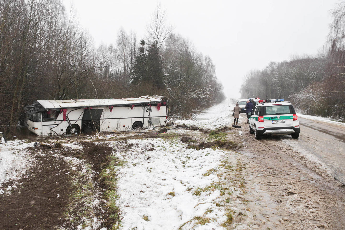 Jo vairuojamas autobusas ketvirtadienį nuslydo nuo kelio ir mažiausiai vieną kartą apsivertė. Šonu trenkęsis į pakelės medžius, sustojo ant ratų.