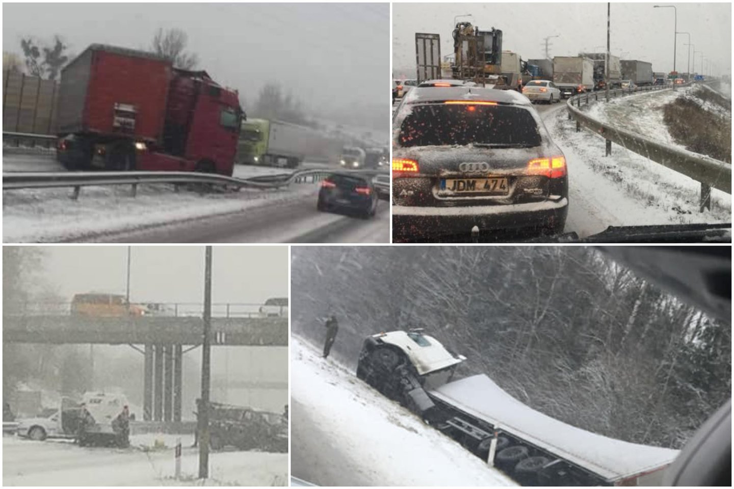 Kaune, vakariniame aplinkkelyje ties Akademija, vairuotojai praneša, kad susidarė milžiniškos eismo spūstys. Vaizdo įrašuose ir nuotraukose matosi net keli nuo nuslydę į pakeles vilkikai, kurie ir užtvėrė ar apsunkino eismą skirtingose kelio atkarpose.