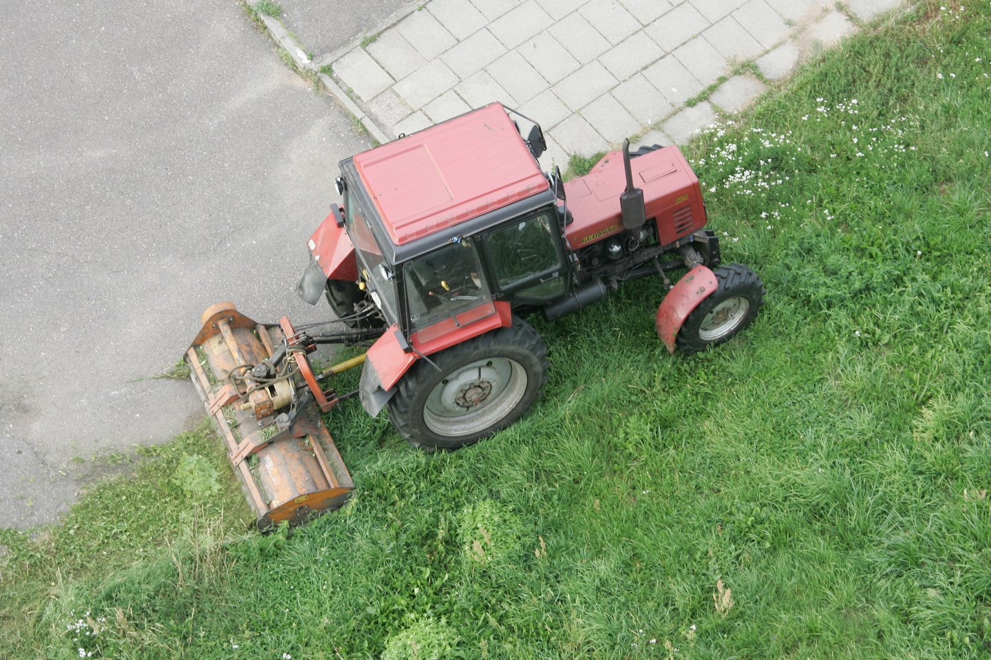 Senas baltarusiškas traktorius apgadintas nesmarkiai. Šiek tiek aplankstyta ir šienapjovė.