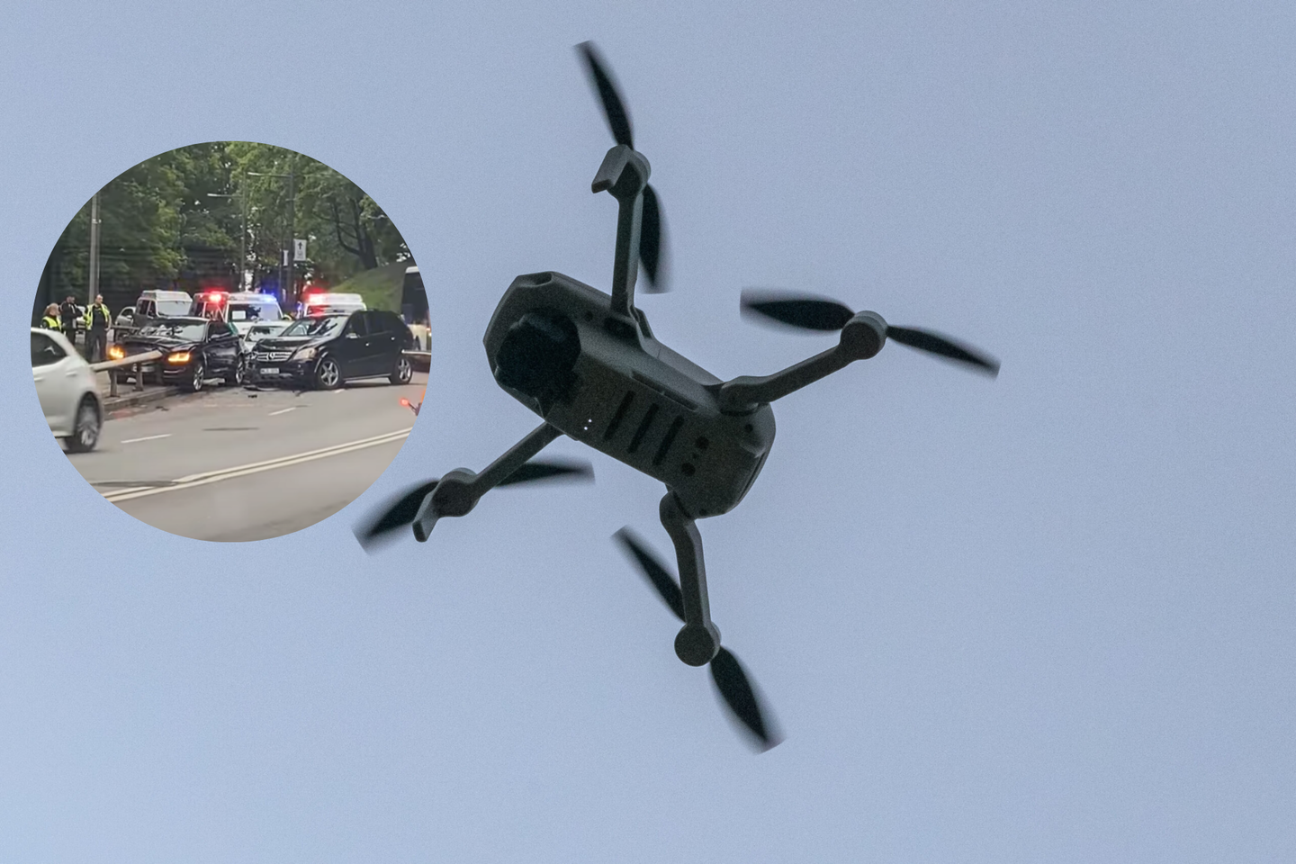 Tikėtina, kad policijos dronas medyje įstrigo aiškinantis įvykio aplinkybes.