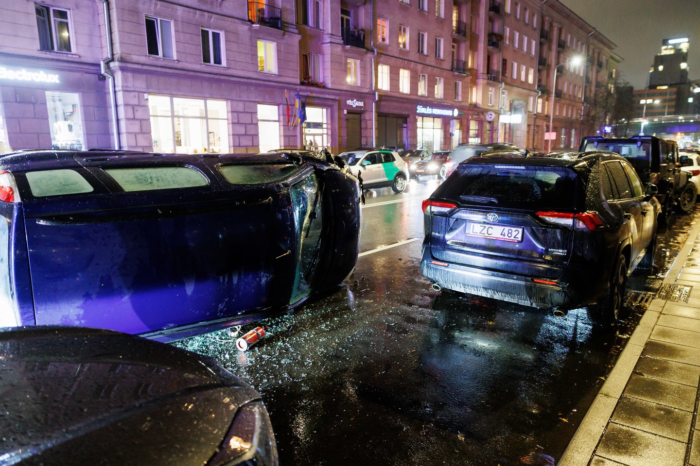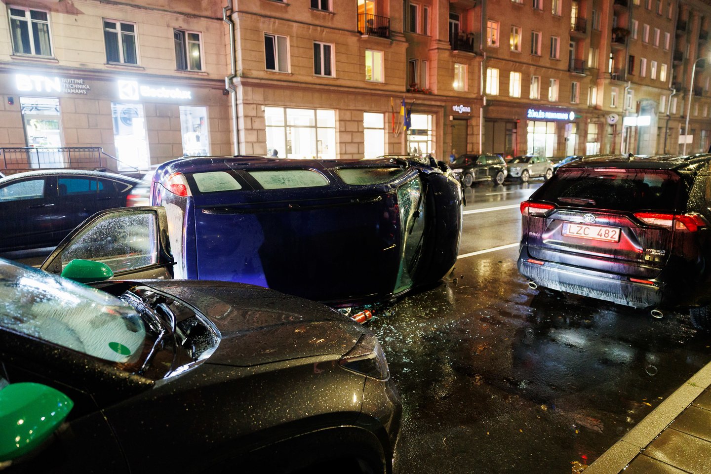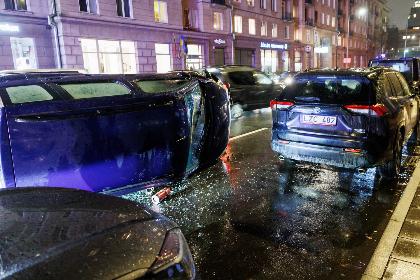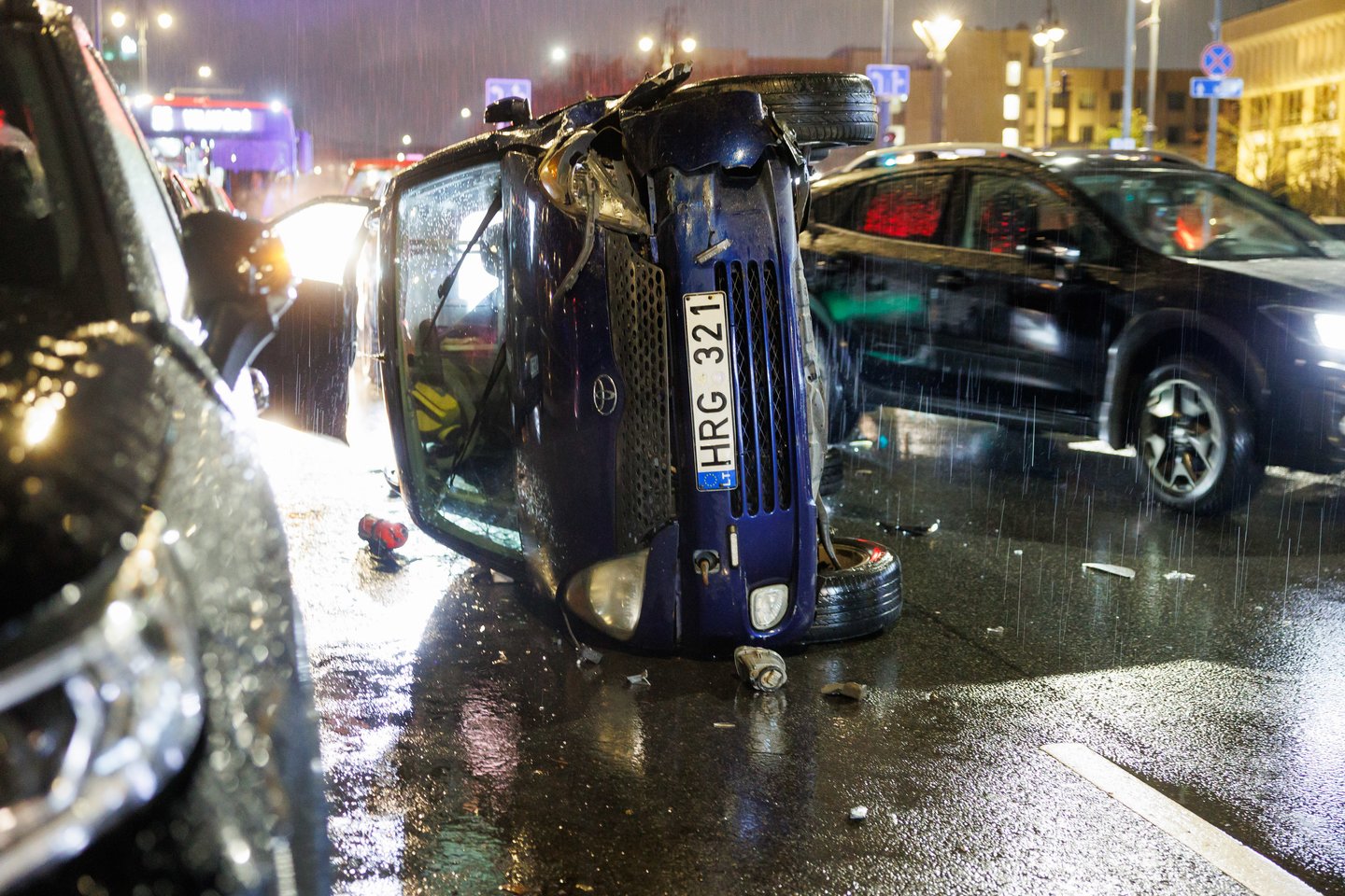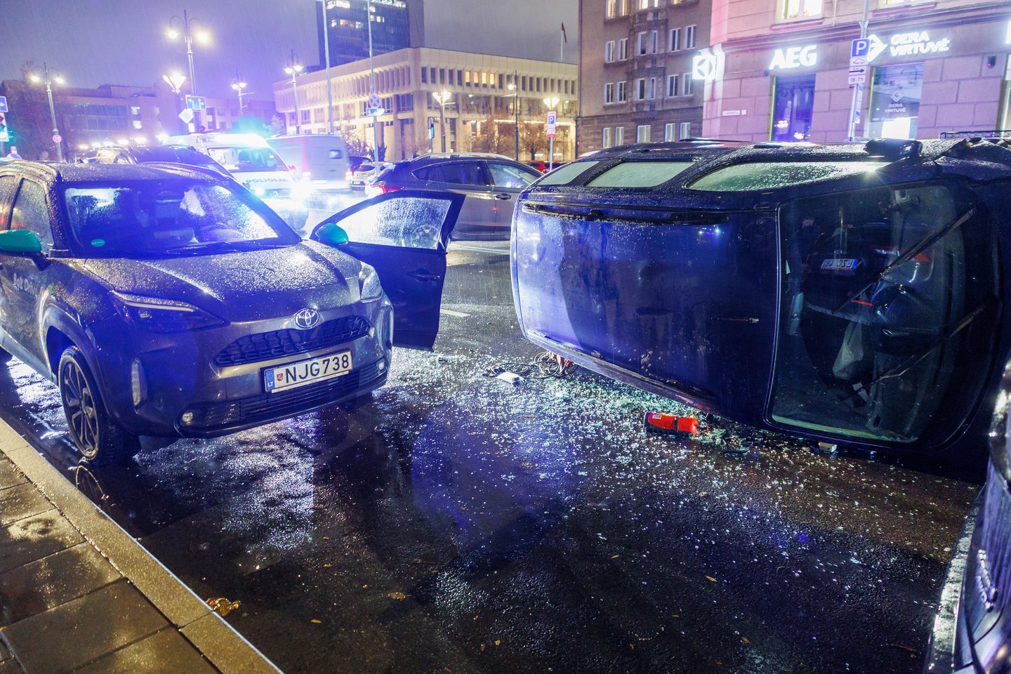 Vienas žmogus nesunkiai nukentėjo pirmadienio vakarą Vilniaus centre susidūrus penkiems automobiliams. Per susidūrimą ties Gedimino pr. ir A.Goštauto g. sankirta vienas automobilis apvirto. Avarija įvyko smarkiai lyjant. Dėl įvykio aplinkinėse gatvėse kuriam laikui susidarė spūstys.