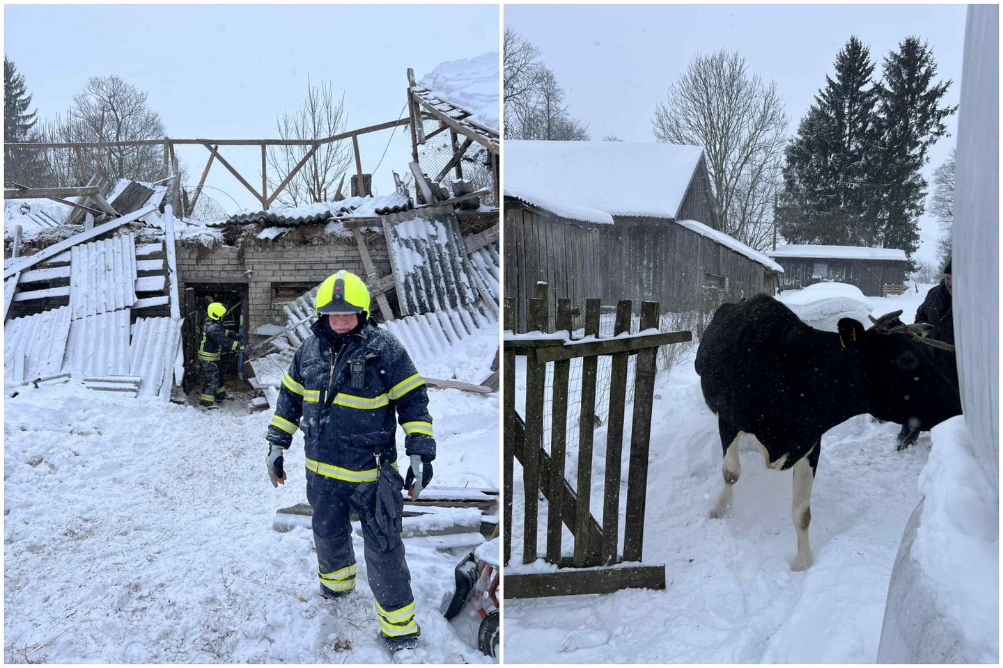 Į įvykio vietą atvykę du ugniagesių ekipažai išvedė gyvulius į lauką ir sutvirtino neįgriuvusio perdengimo dalį.