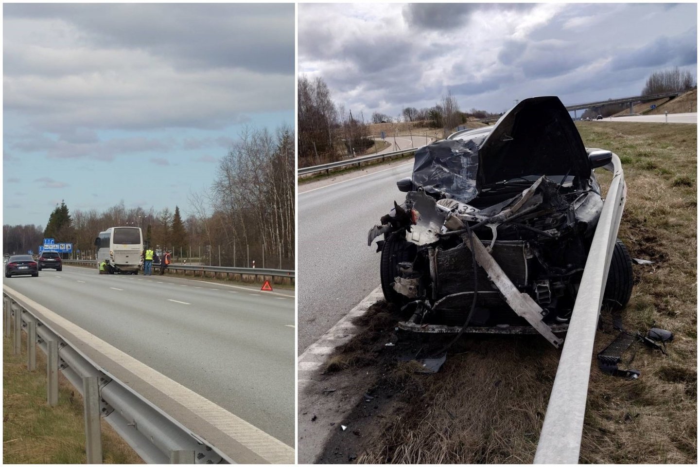 Paaiškėjo, kad automobilis BMW sudaužytas labai smarkiai – po susidūrimo su autobusu jis dar trenkėsi į atitvarus.