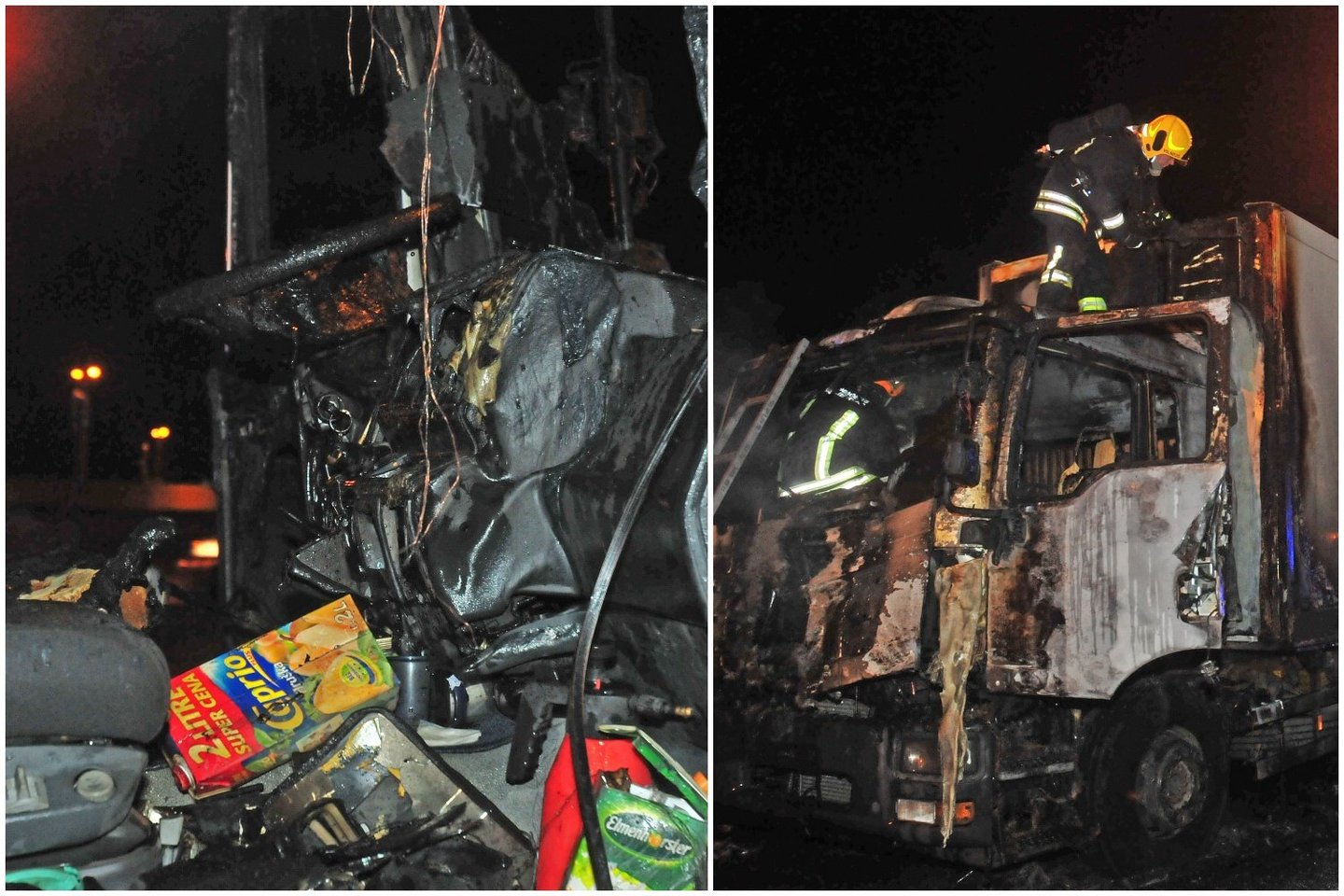 Apdegė sunkiasvorės transporto priemonės kabina.