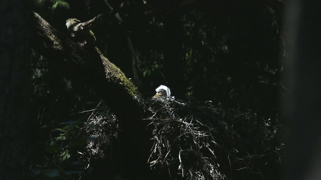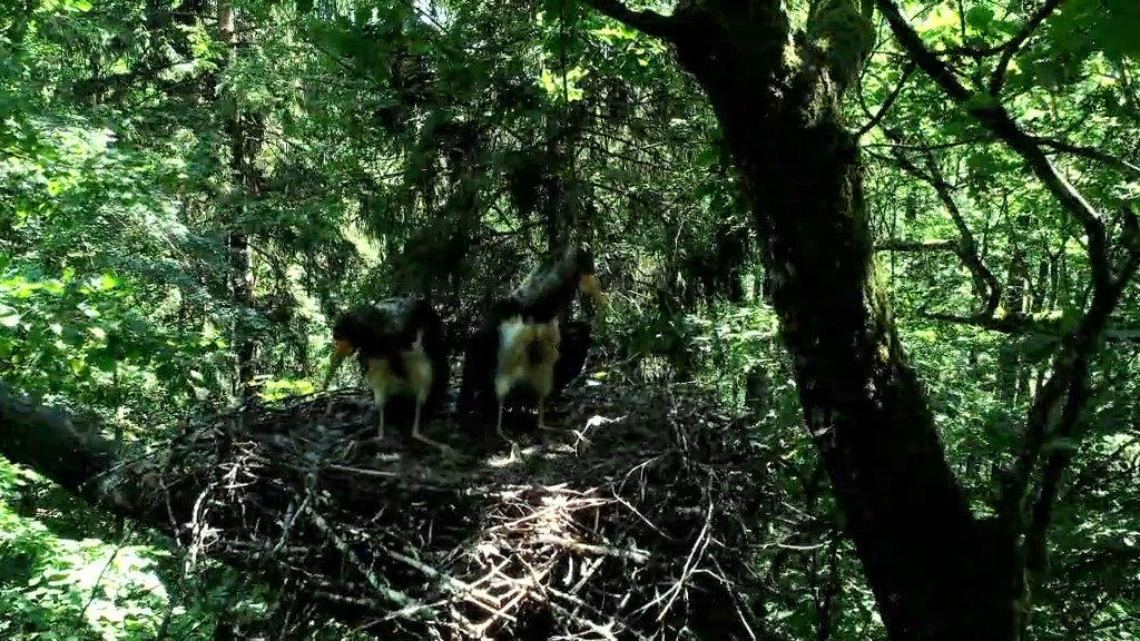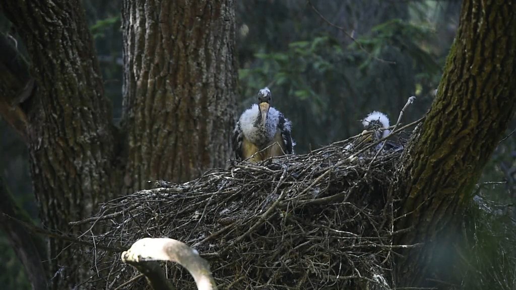 Žvelgiant pro žiūronus matyti, kad ir šiame lizde kyšo pūkuotos galvos. Jų tėvai taip pat išskridę ieškoti maisto.