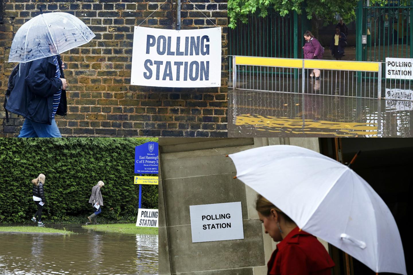 Britai socialiniuose tinkluose dalijasi nuotraukomis, kaip per lietų ir balas klampoja į rinkimų apylinkes. Viena moteris pavadino savo kelionę bibline, nes per apsemtą kiemą ją kažkas turėjo pernešti rankomis.