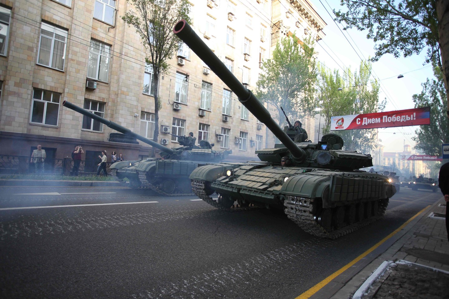 Donecko separatistų lyderis Aleksandras Zacharčenka vadovavo maždaug tūkstančio kovotojų paradui. Kovotojai nešė ilgą juodos ir oranžinės – Rusijos Šv.Georgijaus (Šv.Jurgio) juostos – spalvų transparantą.