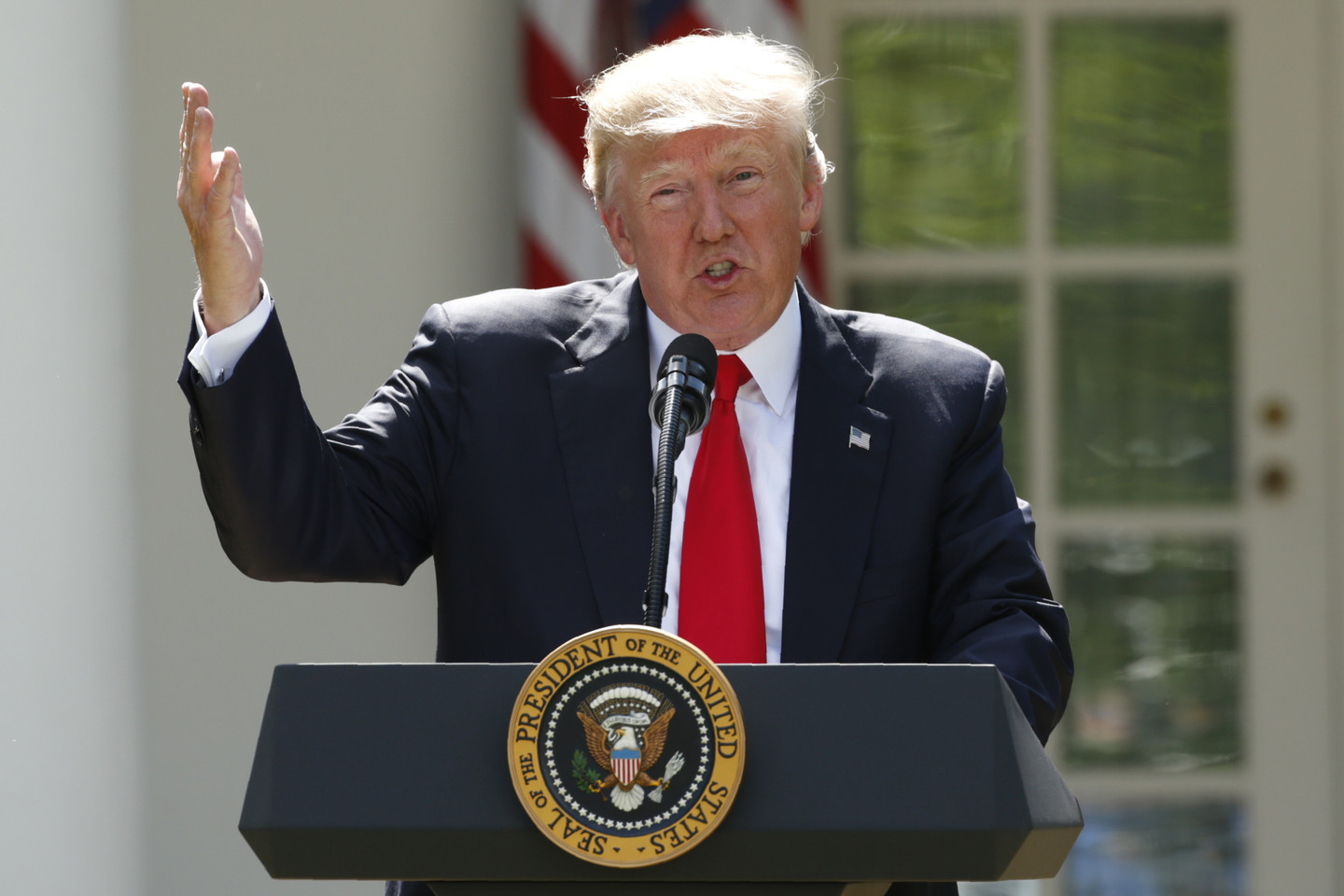 „Aš pažadėjau, kad išeisiu iš arba sustabdysiu bet kokį sandorį, kuris netarnauja Amerikos interesams“, – Baltųjų rūmų Rožių sode sakė D.Trumpas.