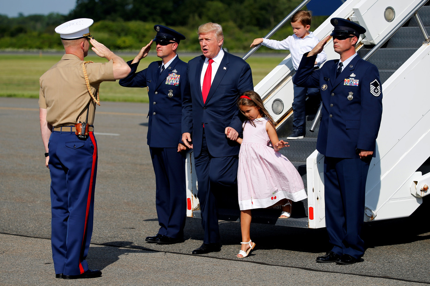 JAV prezidentas iš Vašingtono išskrido penktadienį po pietų. Artimiausias septyniolika dienų jis ketina praleisti savo nuosavame golfo klube Bedministeryje, į kurį atvyko lydimas vaikaičių.