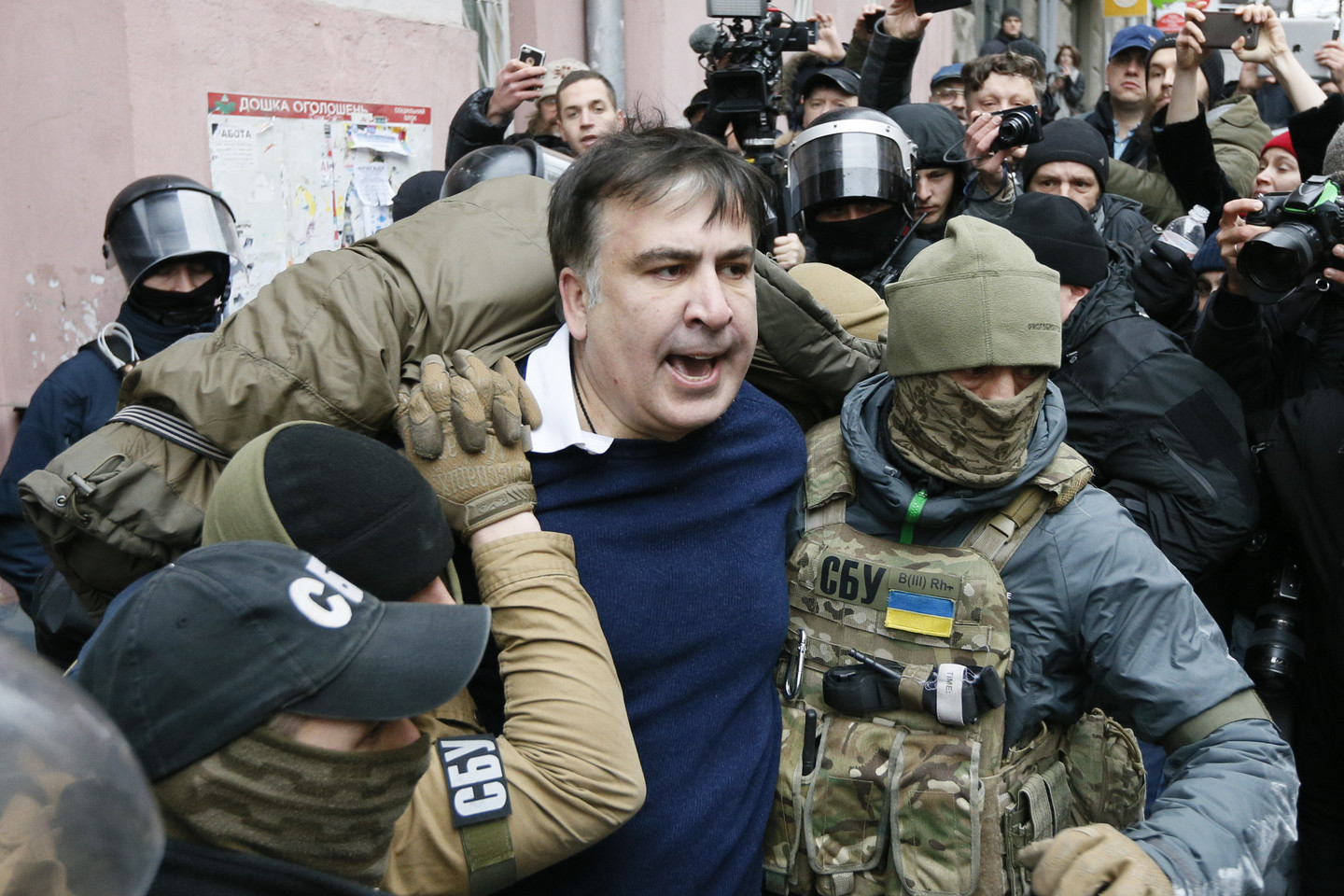 Pareigūnams vykdant operaciją Gruzijos eksprezidento bute, M.Saakašvilis vienu metu buvo užsilipęs ant savo namo Kijevo centre stogo ir pagrasino nuo jo nušokti.