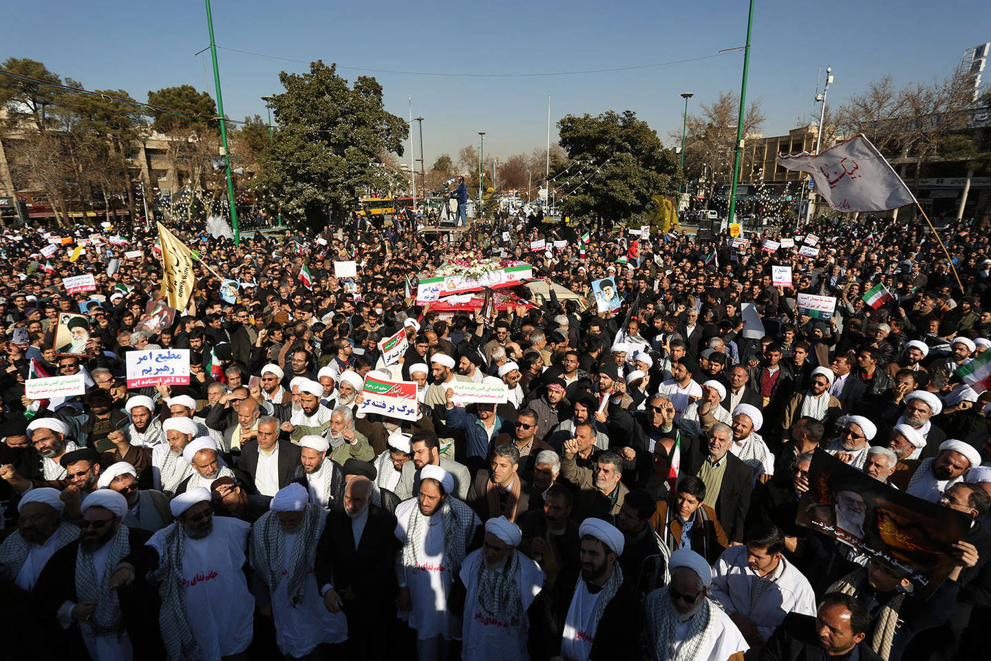Valstybinė televizija ketvirtadienį ryte parodė, kaip dešimtyje šalies miestų, įskaitant Isfahaną, Ardabilį ir Mašhadą, kur praėjusį ketvirtadienį kilo protestų banga, žygiuoja didžiulės minios režimo šalininkų.